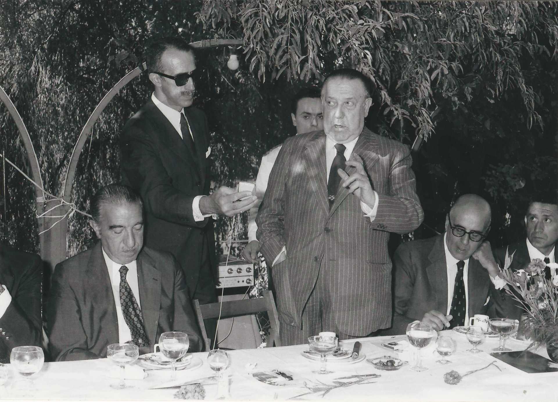 Reverso: "DÍA DE LA PROVINCIA EN ARANJUEZ COMIDA EN EL JARDIN DEL PRINCIPE – EL PRESIDENTE DE LA DIPUTACION DOCTOR GONZALEZ BUENO FUNDADOR DE LA RESIDENCIA DE ARANJUEZ 'RUSIÑOR' DISERTANDO 11-9-1971"