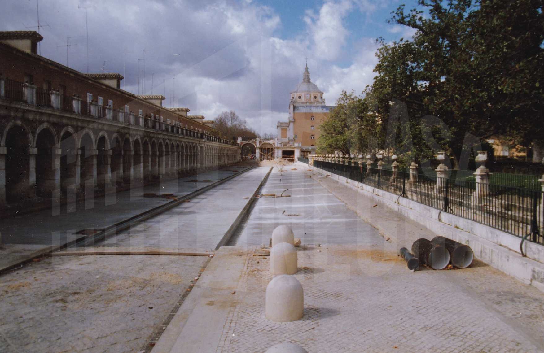 Avenida de Palacio en obras con el Palacio Real, el Jardín del Parterre y las arcadas de la Casa de Oficios de Aranjuez