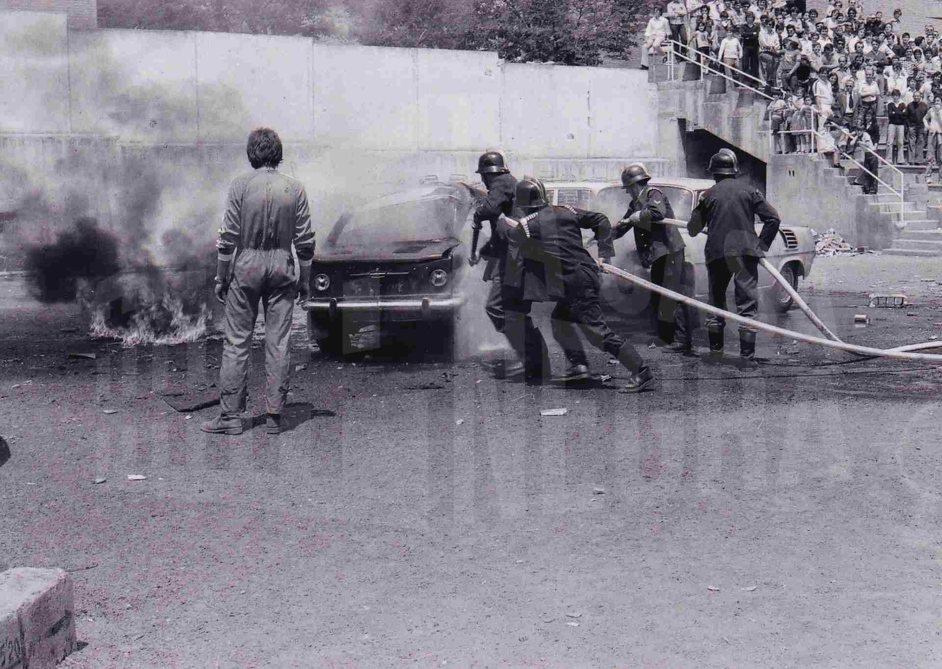 Bomberos apagando fuego en un espectáculo de acrobacias automovilistas del especialista Alain Petit en Aranjuez