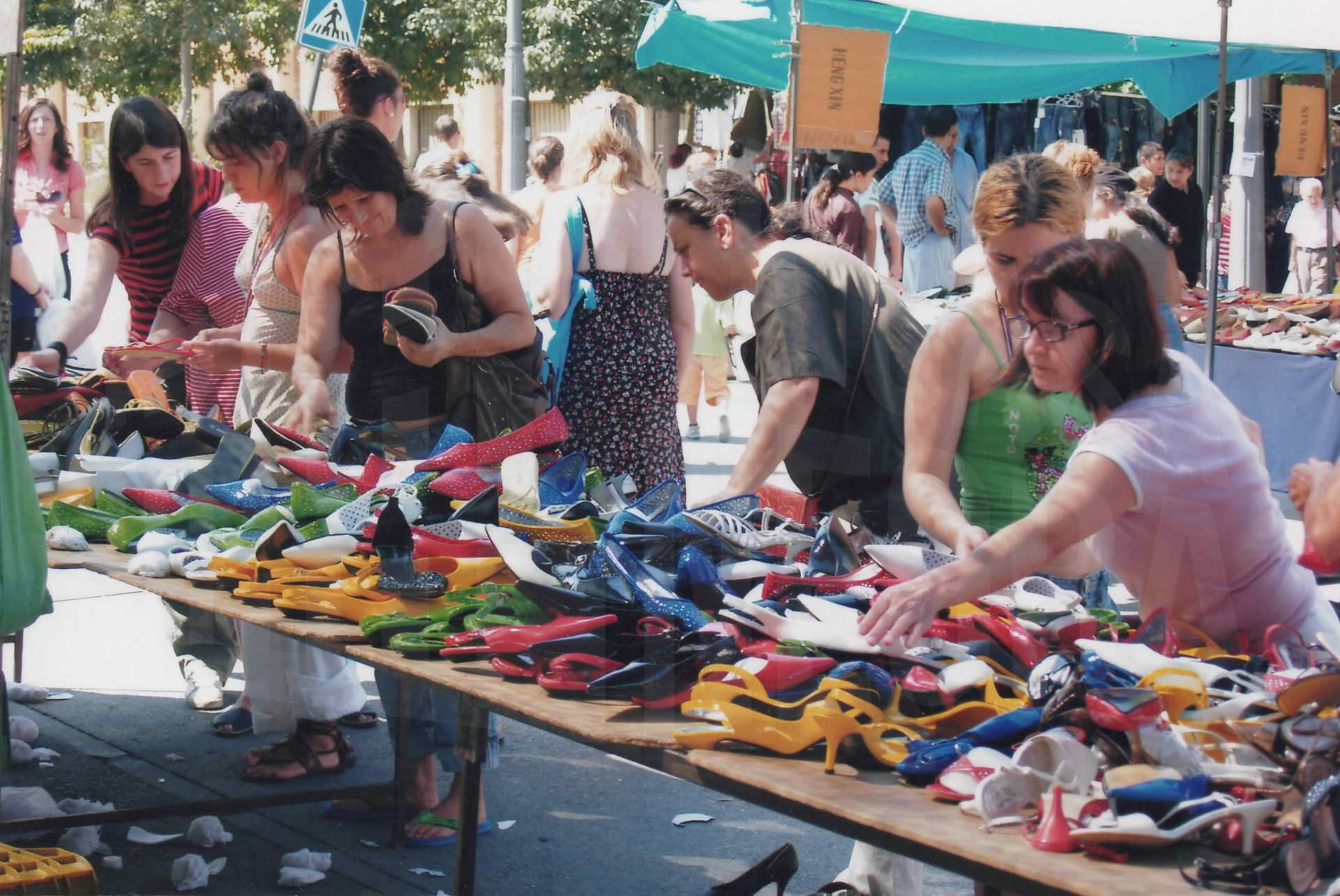 Clientas delante de un puesto de ropa en el Rastro de Aranjuez