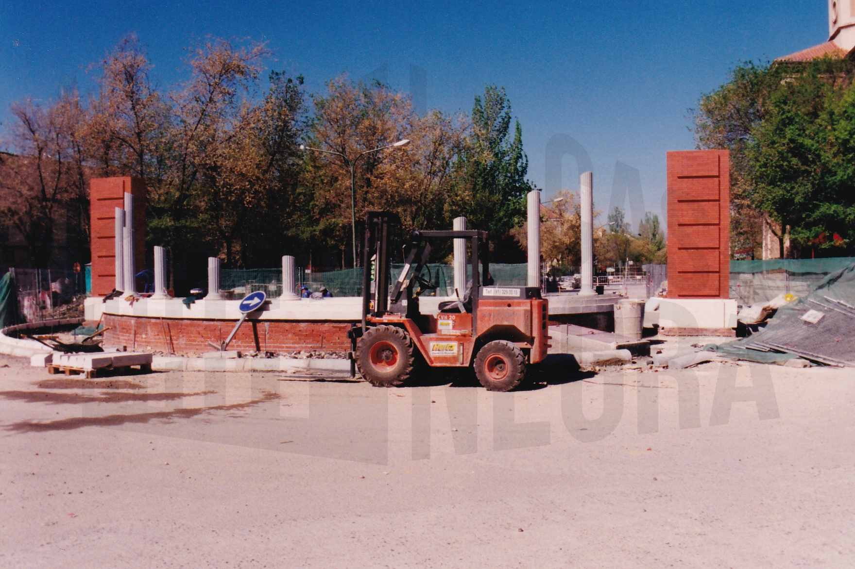 Construcción de la fuente en la confluencia de las calles Foso y Moreras en Aranjuez, con la iglesia de Alpajés al fondo