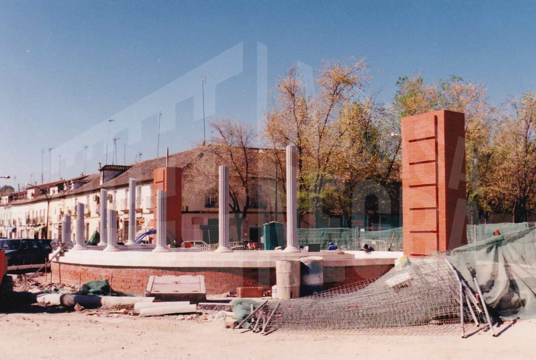 Construcción de la fuente en la confluencia de las calles Foso y Moreras en Aranjuez, con la iglesia de Alpajés al fondo