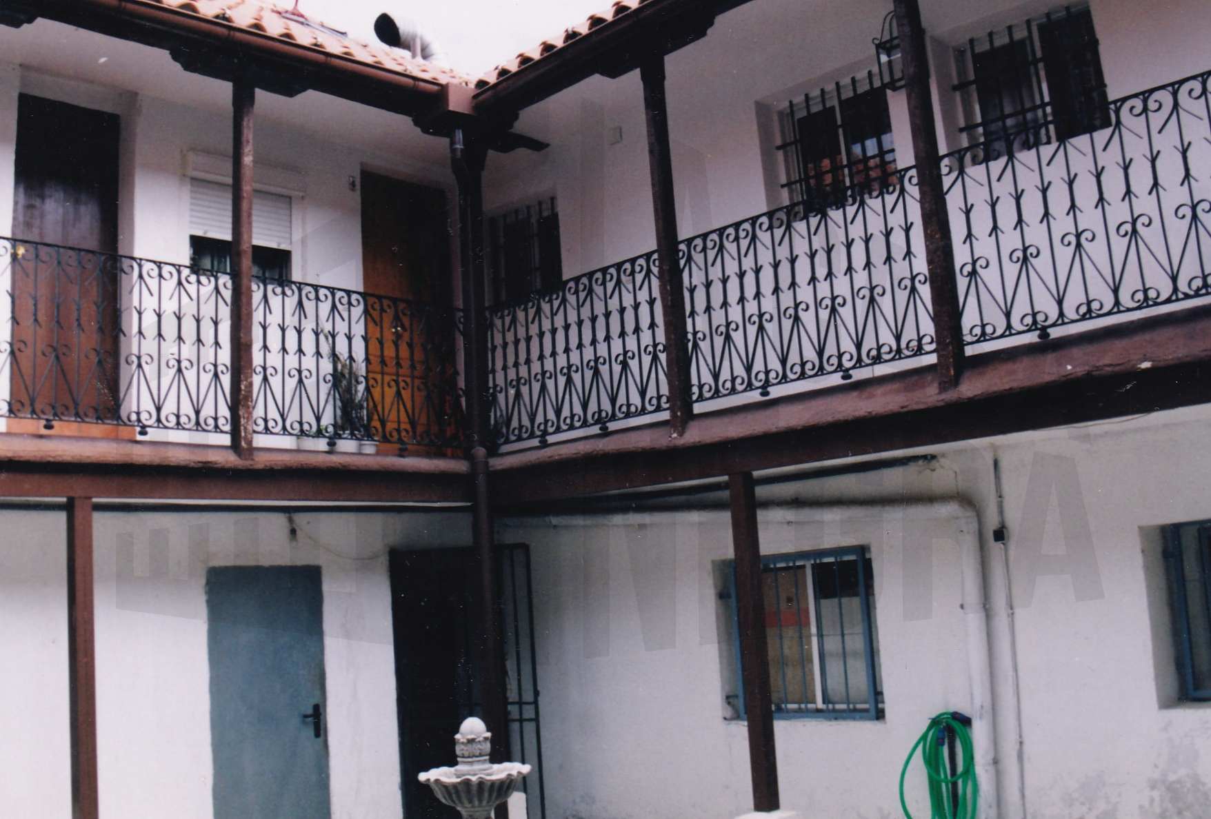 Corredores y una fuente en el patio de una corrala en la Calle Gobernador de Aranjuez