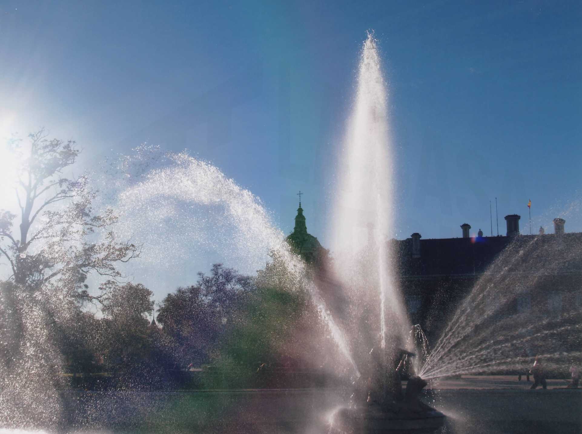 Cúpula del Palacio Real de Aranjuez a través de un chorro de agua de la Fuente de Ceres del Jardín del Parterre