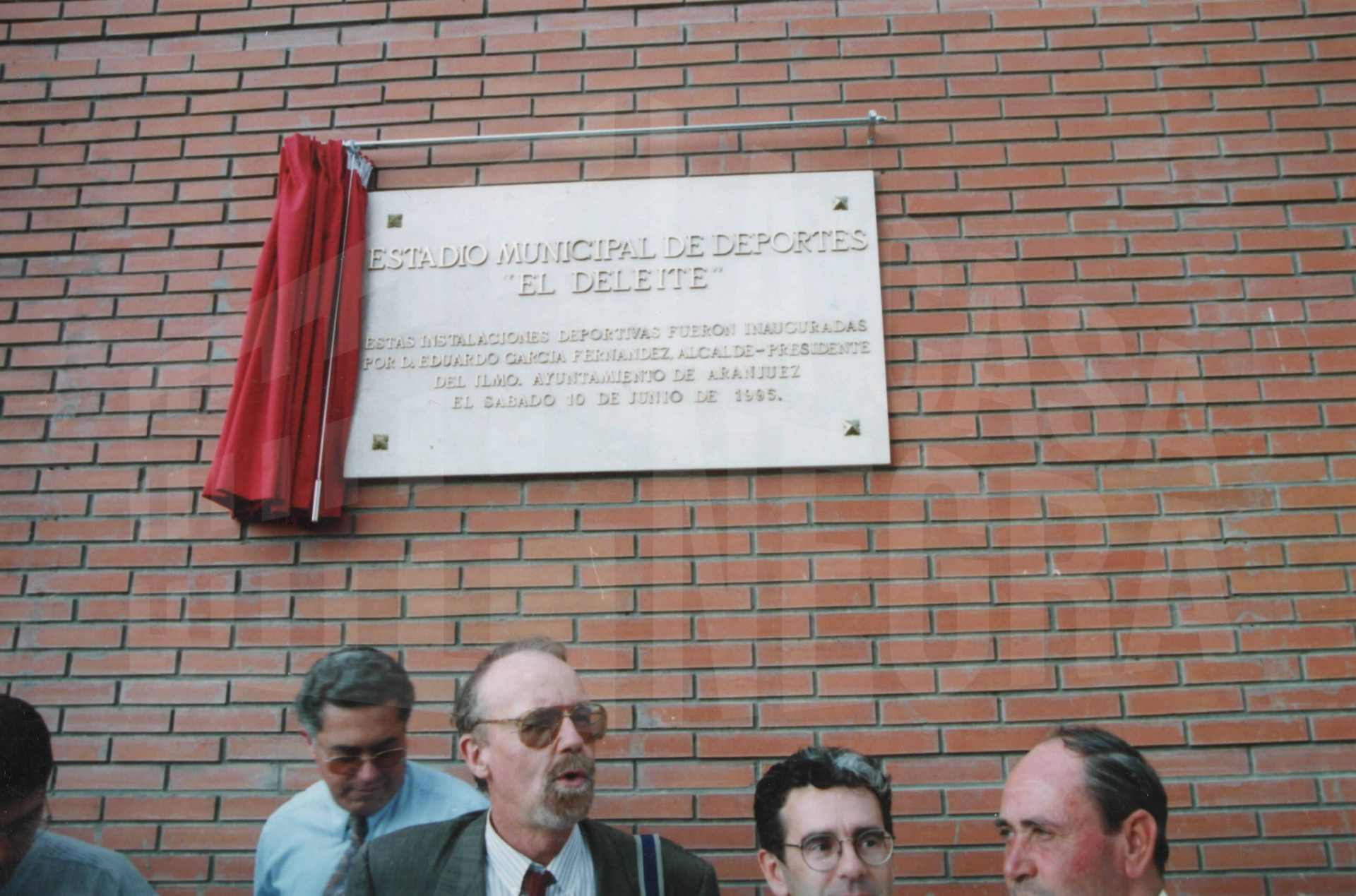 Descubrimiento de la placa conmemorativa de la inauguración del Centro Municipal de Deportes «El Deleite» por el alcalde de Aranjuez Eduardo García