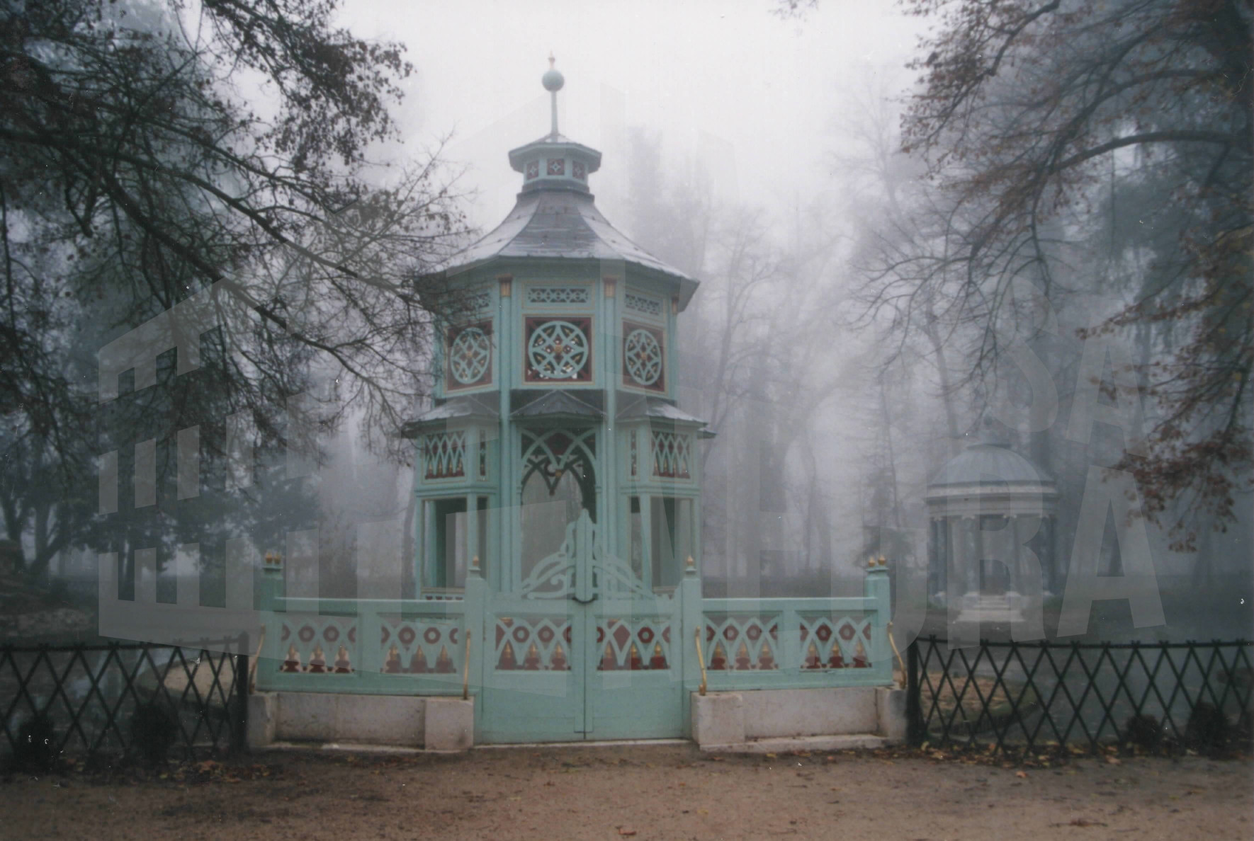 Dos jarrones de la Plaza de Pamplona en el Jardín del Príncipe en Aranjuez en un día de niebla