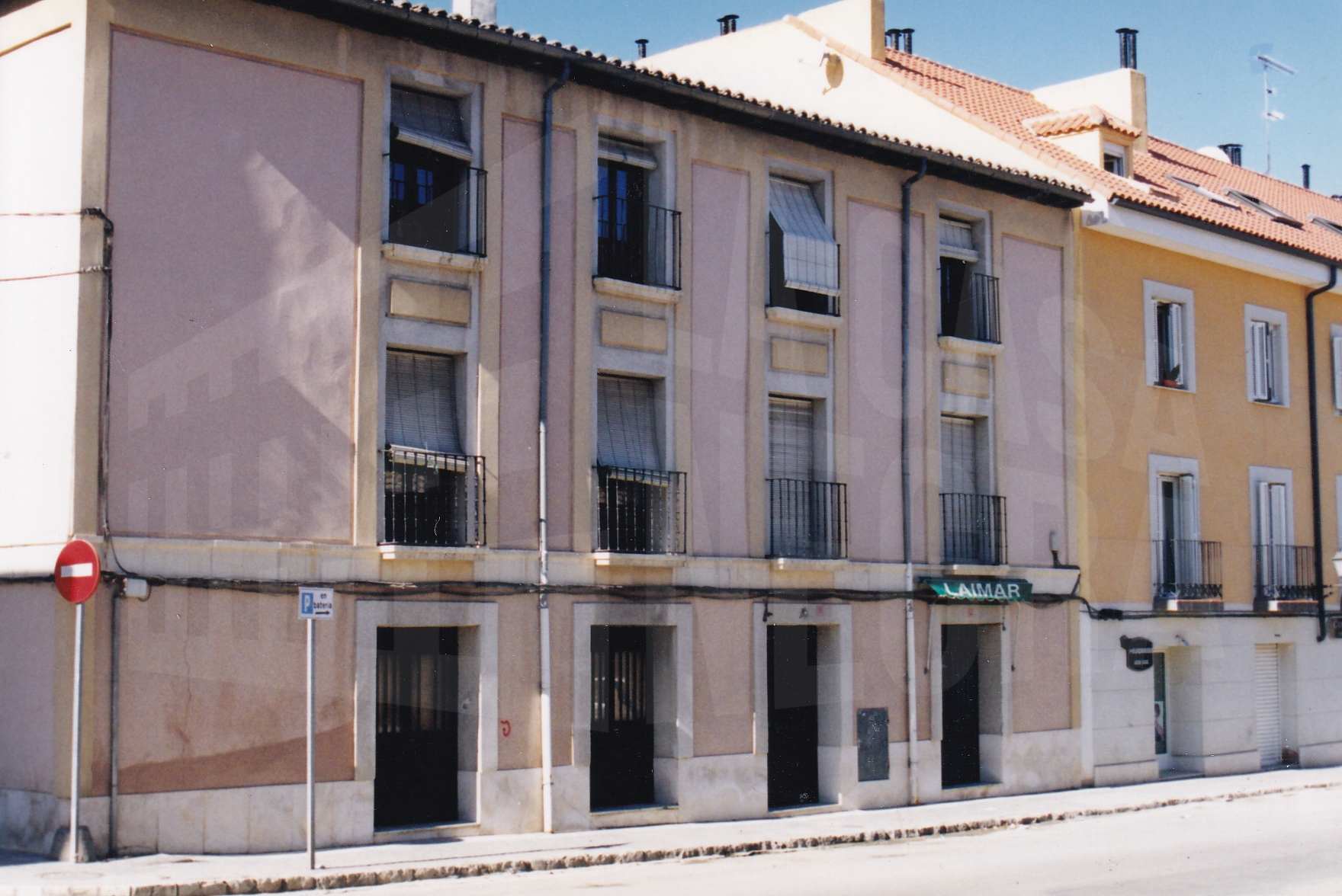 Edificios en la Calle Postas de Aranjuez con un comercio y la puerta de entrada a una corrala