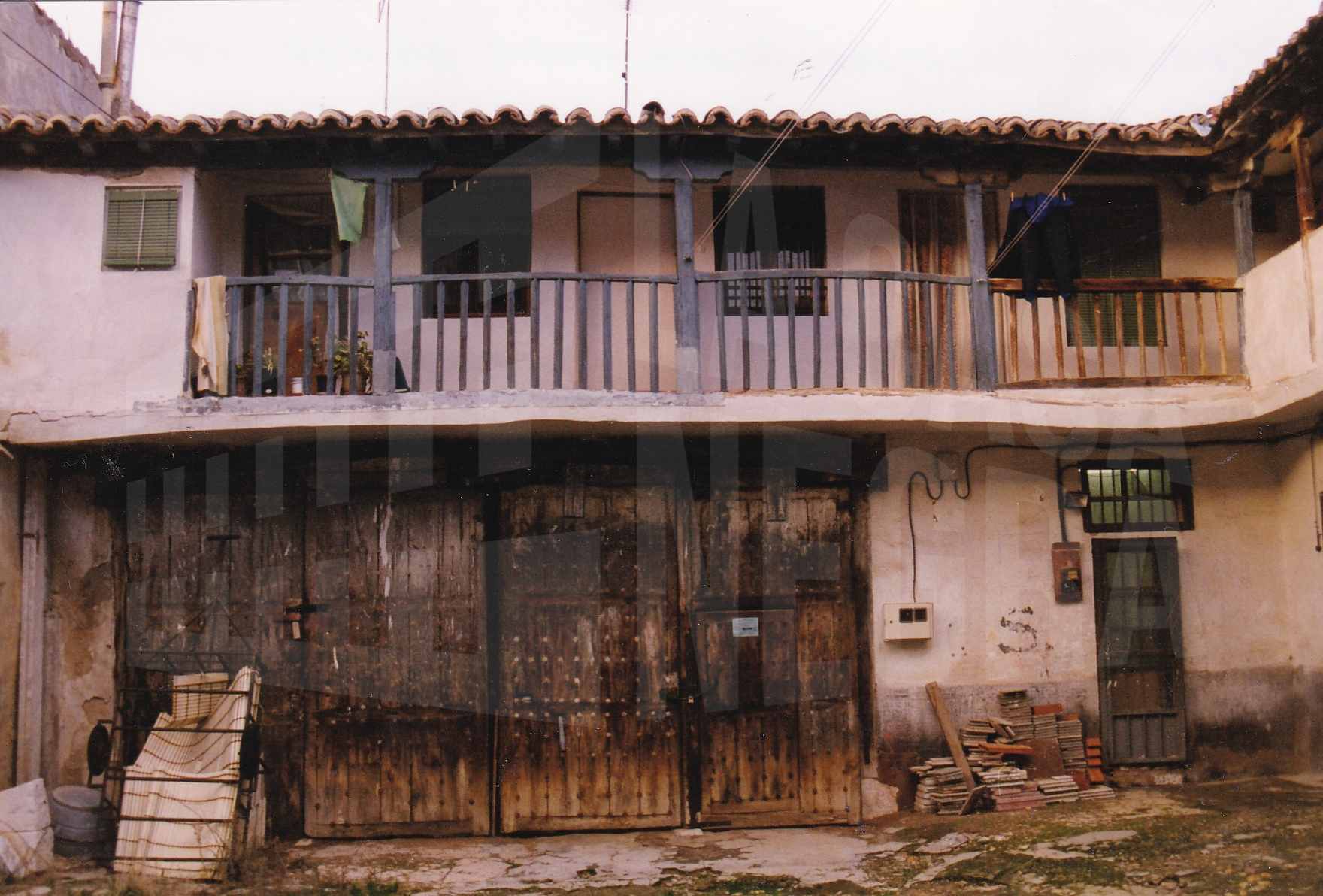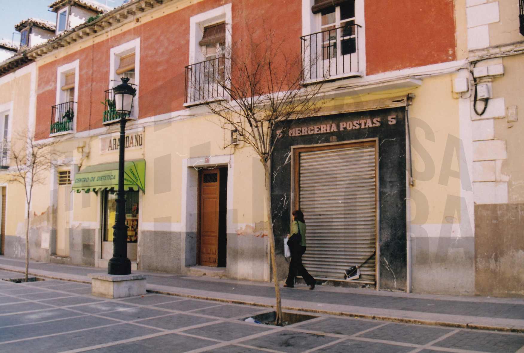 Edificios en la Calle Postas de Aranjuez con varios comercios y la puerta de entrada a una corrala de Aranjuez