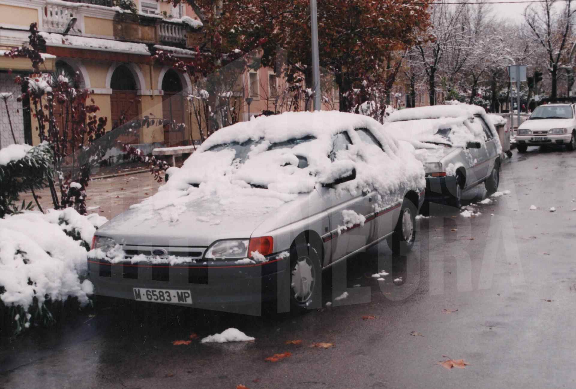 Edificios nevados en la calle del Príncipe de Aranjuez