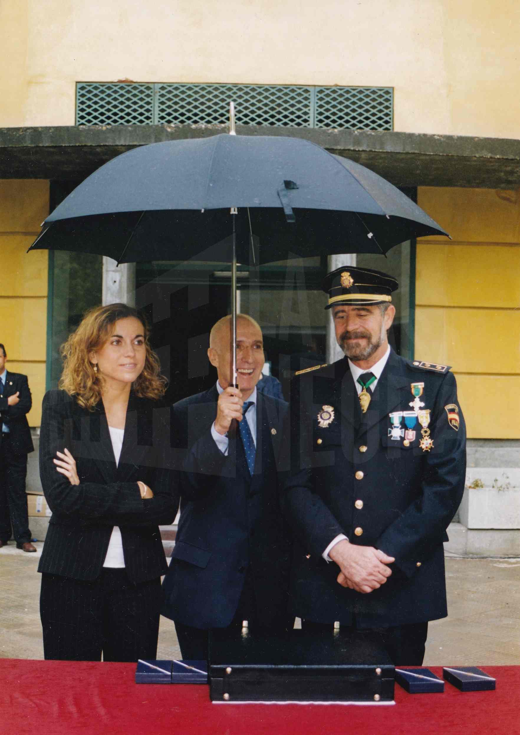 Reverso: "ACTO DE LA FIESTA DEL PATRON DE LA POLICIA NACIONAL SANTOS ANGELES CUSTODIOS CELEBRADO EN EL CORTIJO DE SAN ISIDRO ALCALDE JESUS DIONISIO BALLESTEROS Y EL JEFE DE LA COMISARIA DE POLICIA DE ARANJUEZ - JULIO LAGUNA 03 OCT 2005"