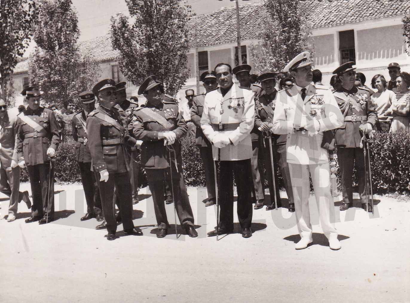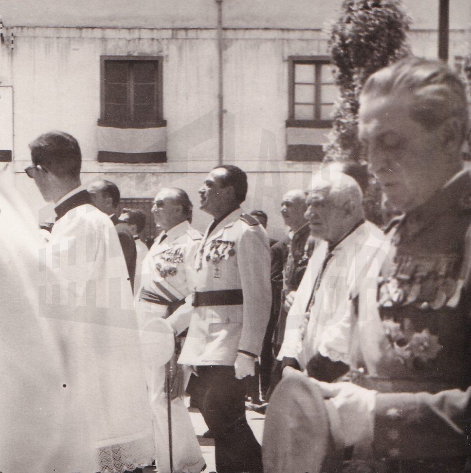 El Alcalde de Aranjuez, Manuel García Moreno, con el uniforme de gala del Movimiento durante una procesión acompañado del varias personas