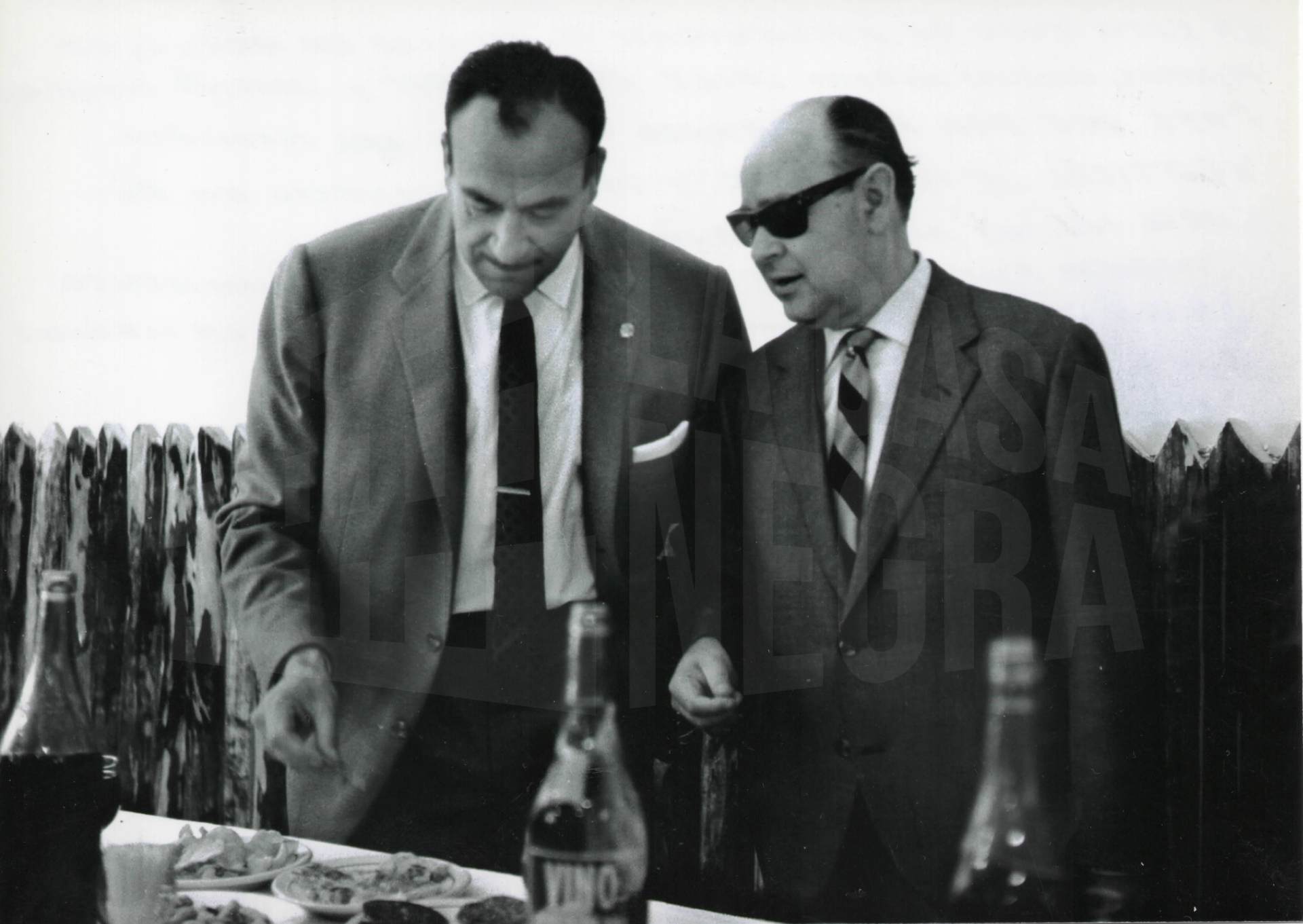Reverso: "EN ESTA FOTO SE ENCUENTRAN EL ALCALDE DE ARANJUEZ MANUEL GARCIA MORENO DESDE 1958 a 1971 Y ANTONIO GUARDIOLA SAEZ QUE ERA EL DELEGADO COMARCAL DEL SINDICATO VERTICAL DE ARANJUEZ Y QUE PERMANECIO EN EL CARGO MUCHOS AÑOS HASTA SU MUERTE. TAMBIEN FUE ALCALDE DE ARANJUEZ INTERINAMENTE EN UN PERIODO DE 1949 HASTA LA LLEGADA A LA ALCALDIA CARLOS RICHER LOPEZ AÑOS "60"
