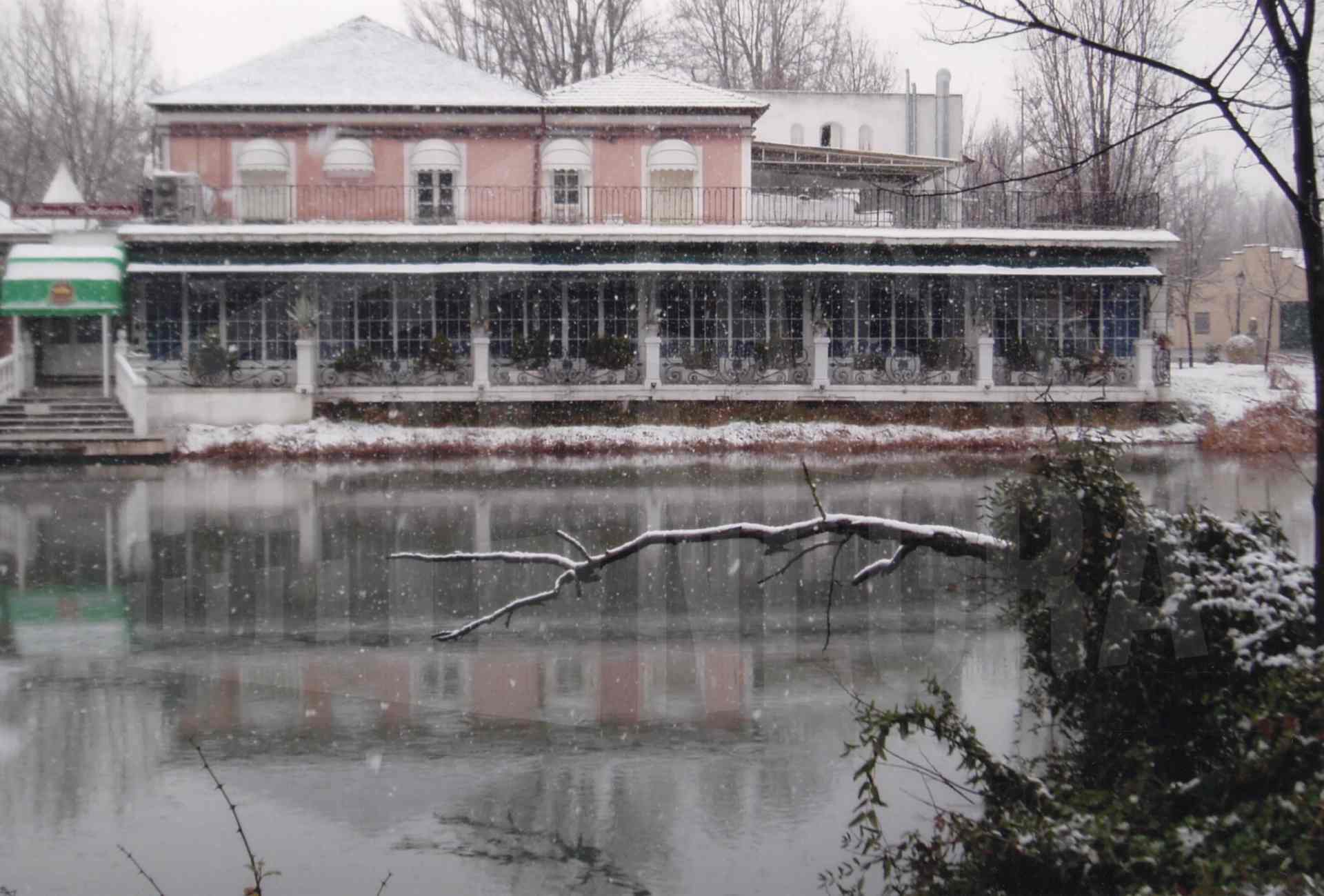 El desaparecido Hotel Delicias visto desde el Jardín del Príncipe de Aranjuez durante una nevada