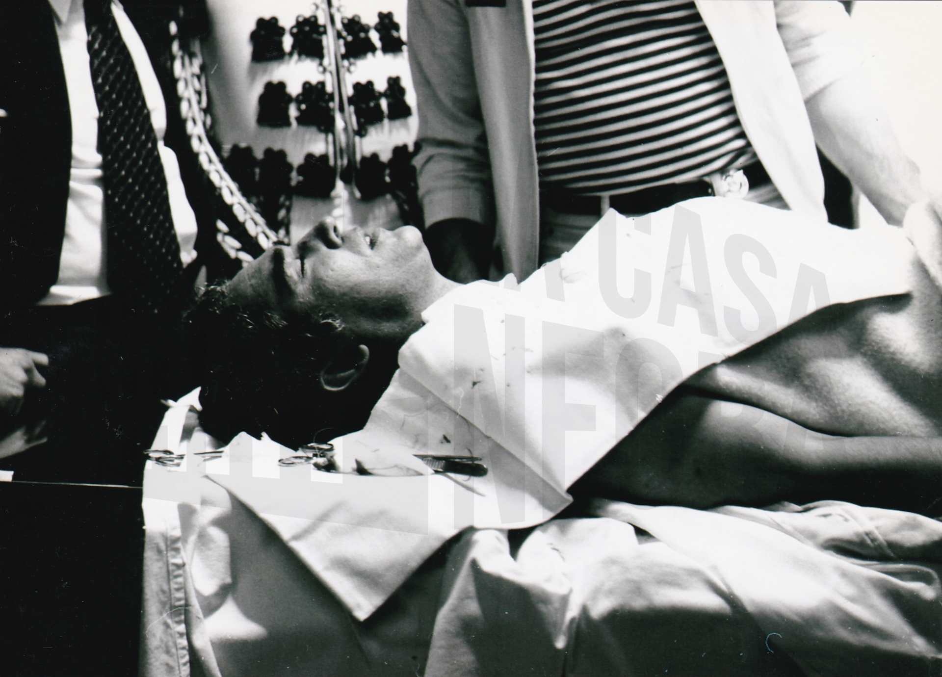 Reverso: "ENFERMERÍA DE LA PLAZA DE TOROS DE ARANJUEZ. EL DOCTOR FRANCISCO HERMIDA Y EL PRACTICANTE LUÍS RUBIO FIRMAN DOCUMENTOS PARA PODER HACER LA FAENA CON ESTOQUE DE MADERA"