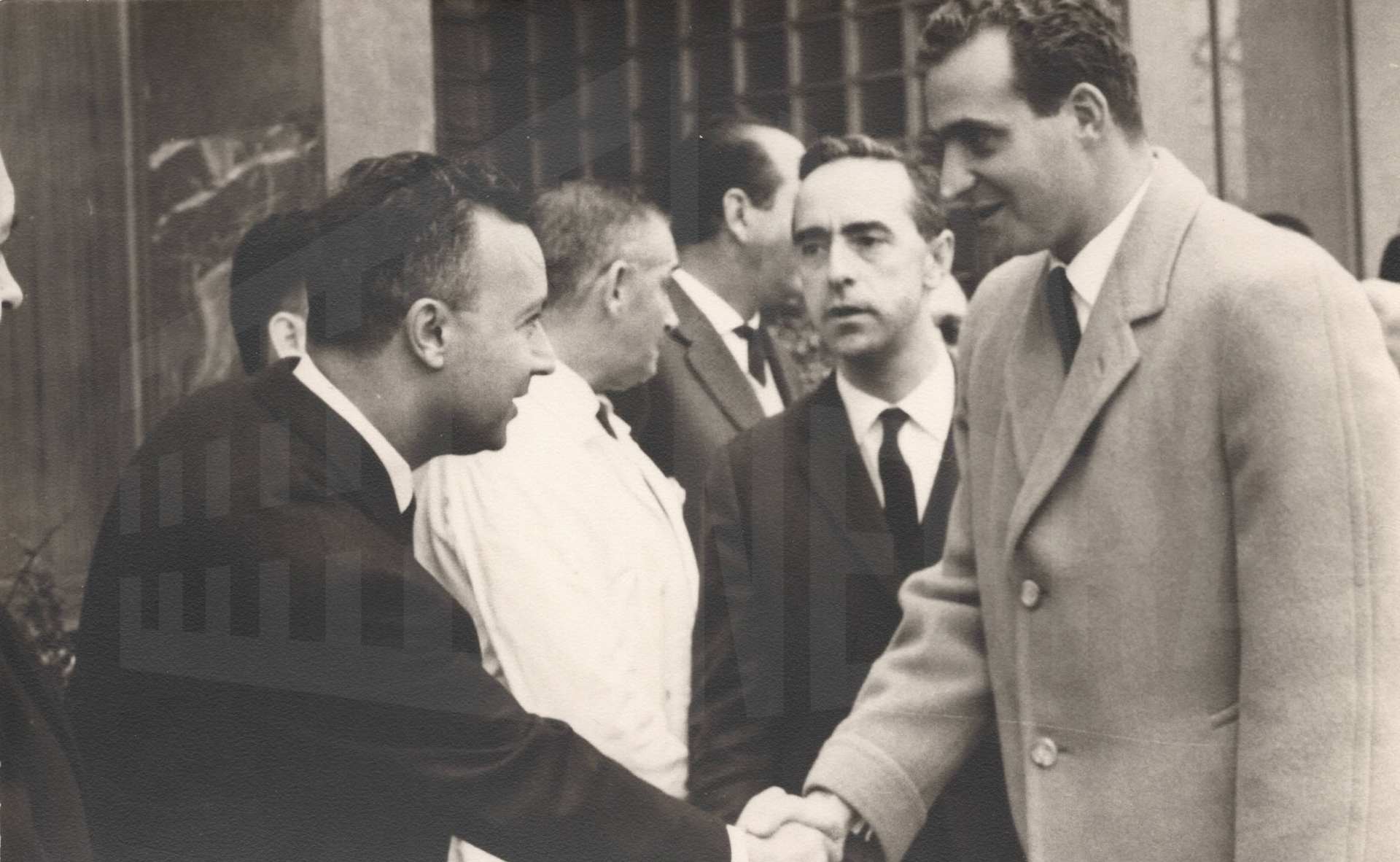 El Príncipe Juan Carlos de Borbón junto a personal directivo y autoridades durante su visita a las instalaciones de la fábrica MAFE (Manufacturas Fotográficas Españolas) en Aranjuez