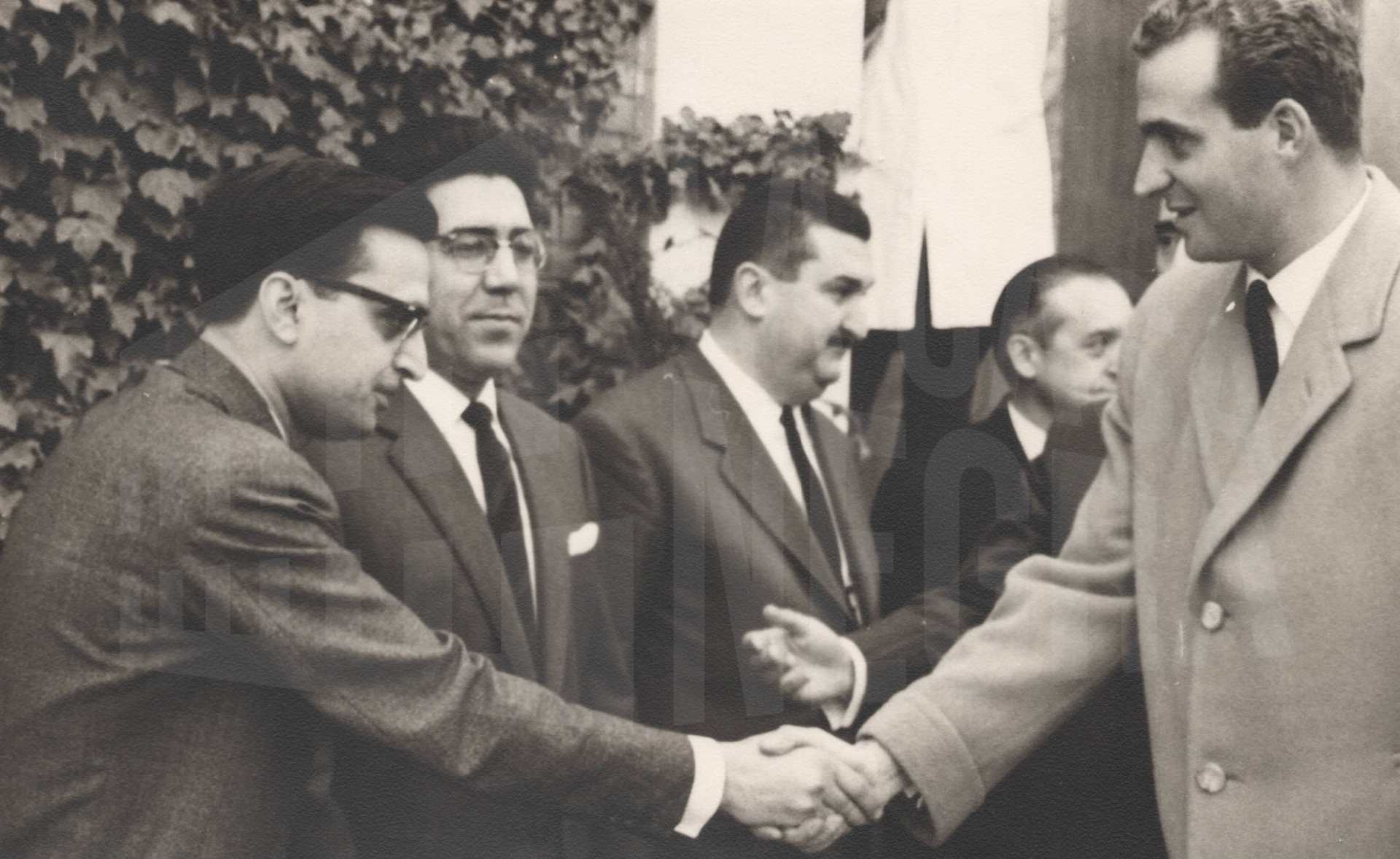 El Príncipe Juan Carlos de Borbón junto a personal directivo y autoridades durante su visita a las instalaciones de la fábrica MAFE (Manufacturas Fotográficas Españolas) en Aranjuez