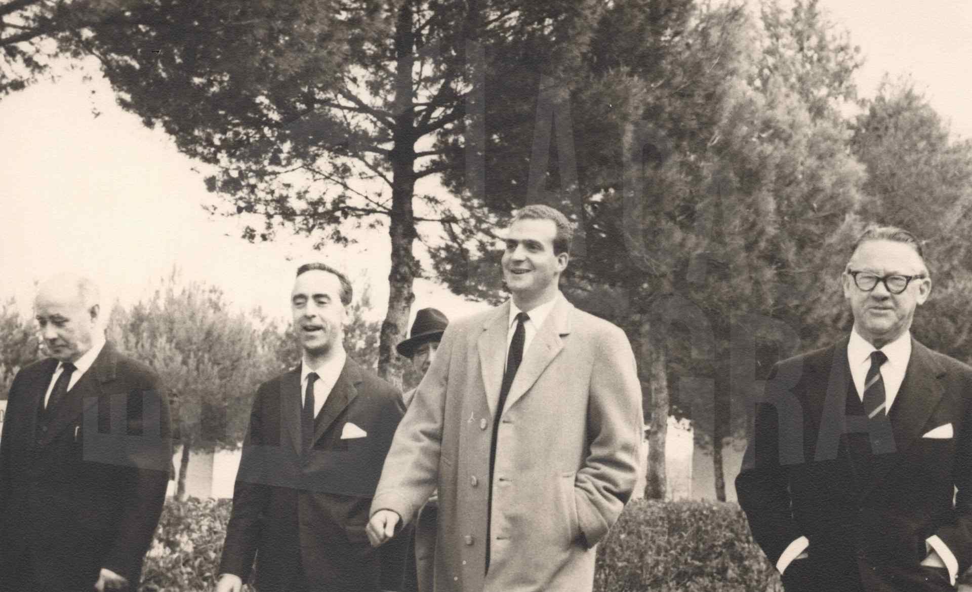 El Príncipe Juan Carlos de Borbón junto a personal directivo y autoridades durante su visita a las instalaciones de la fábrica MAFE (Manufacturas Fotográficas Españolas) en Aranjuez