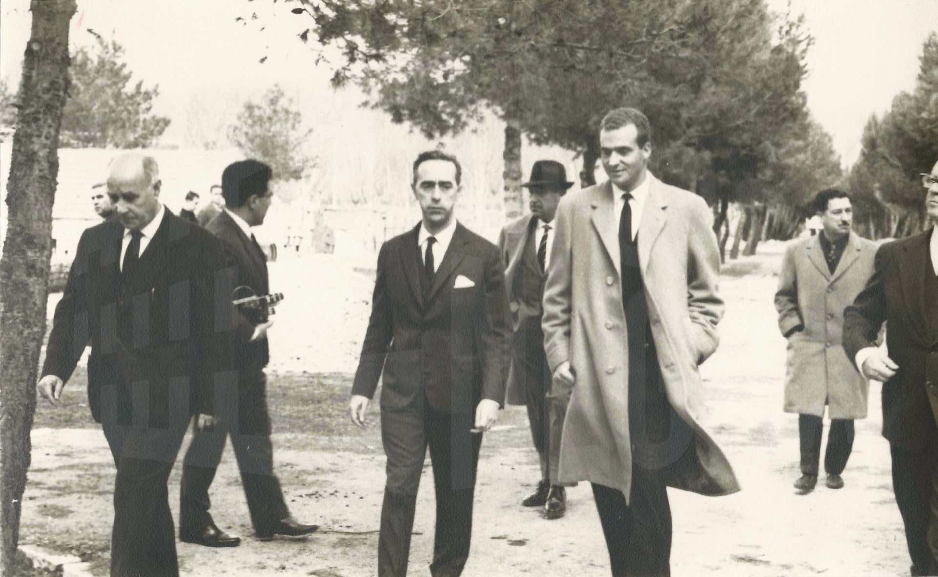 El Príncipe Juan Carlos de Borbón junto a personal directivo y autoridades en su visita a las instalaciones de la fábrica MAFE (Manufacturas Fotográficas Españolas) en Aranjuez
