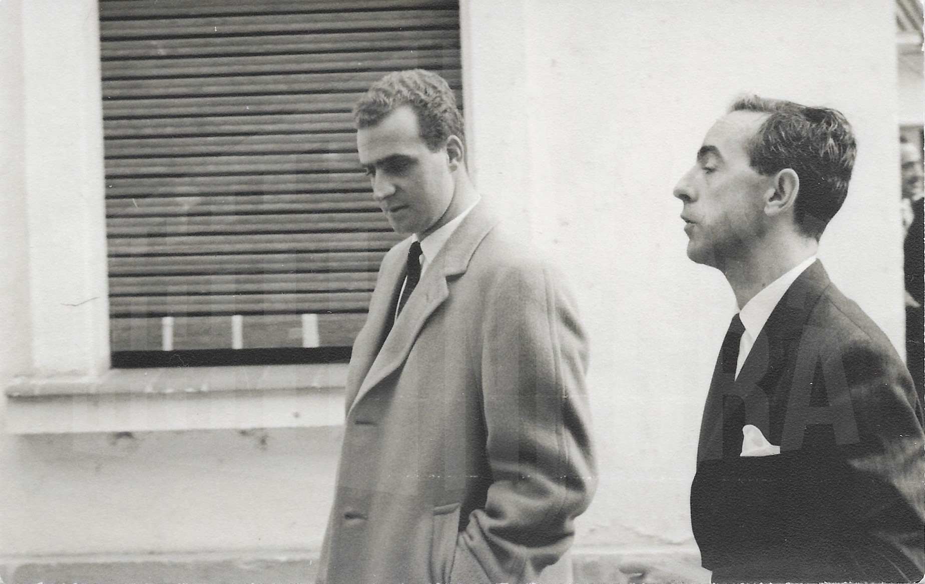 El príncipe Juan Carlos, el Director General de MAFE (Manufacturas Fotográficas Españolas), Miguel Salis Balzola, y otra persona durante la visita oficial a la fábrica