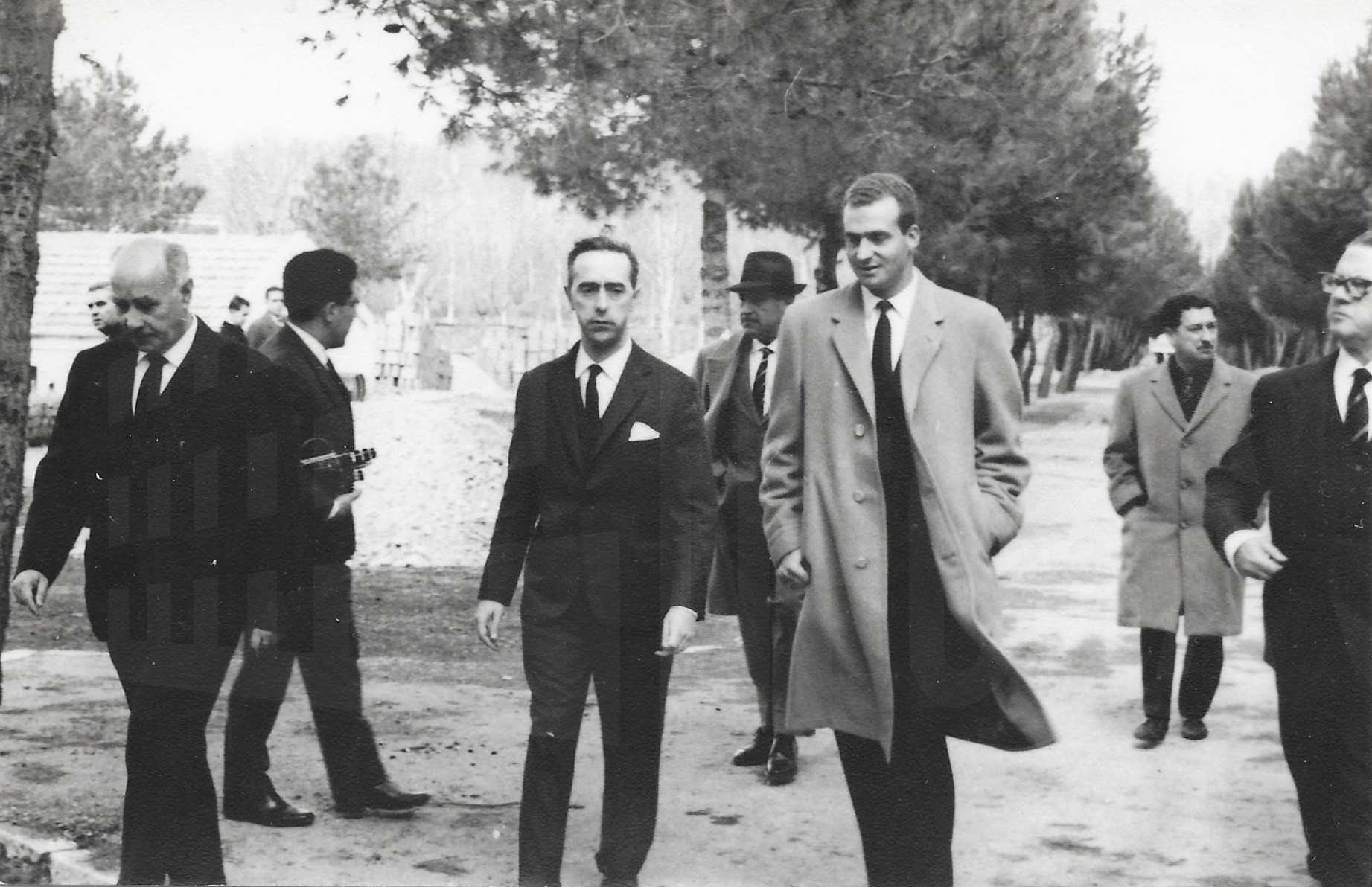 El príncipe Juan Carlos y otra persona durante la visita oficial a la fábrica de MAFE (Manufacturas Fotográficas Españolas) en Aranjuez