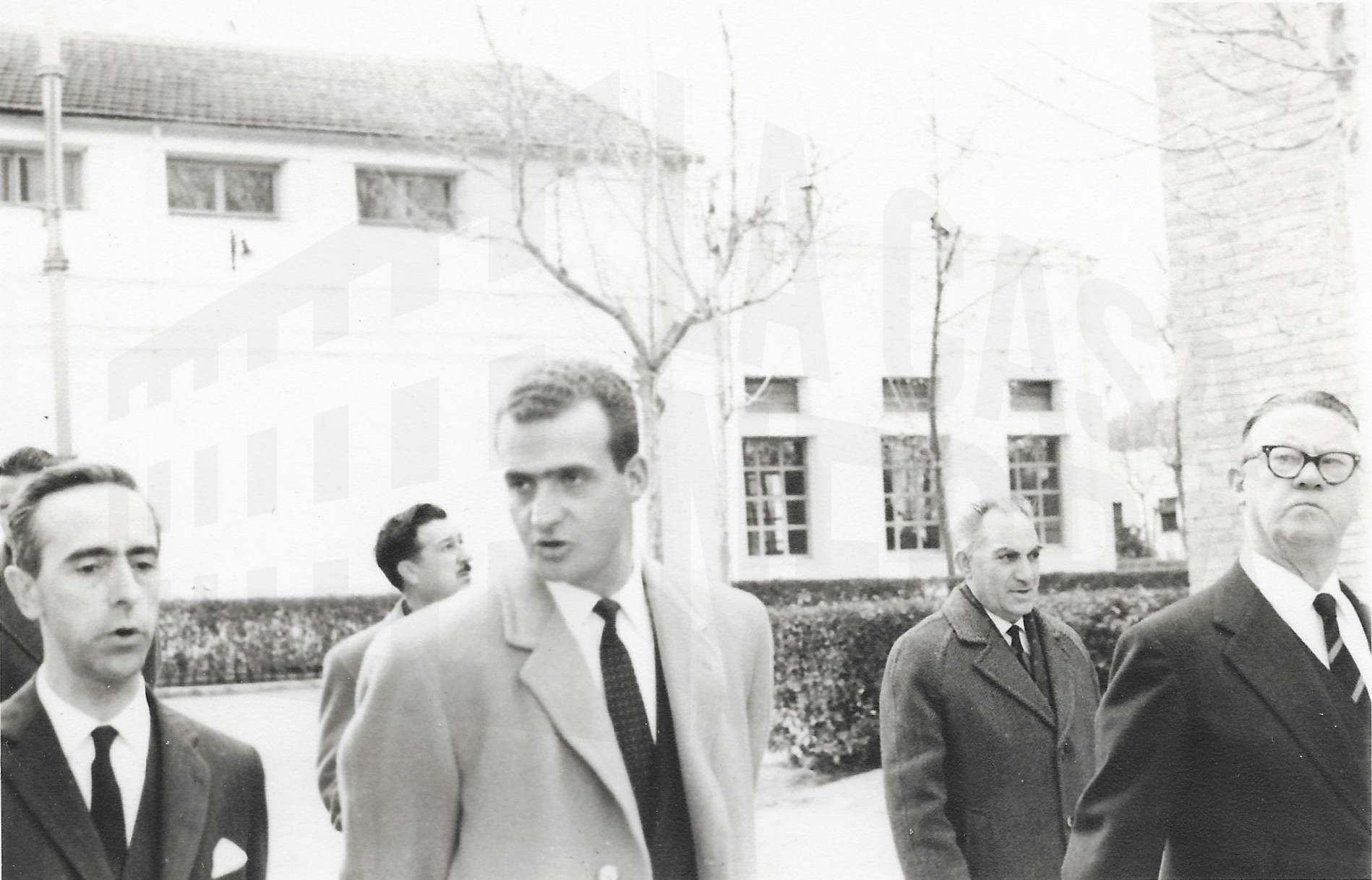 El príncipe Juan Carlos y otra persona durante la visita oficial a la fábrica de MAFE (Manufacturas Fotográficas Españolas) en Aranjuez