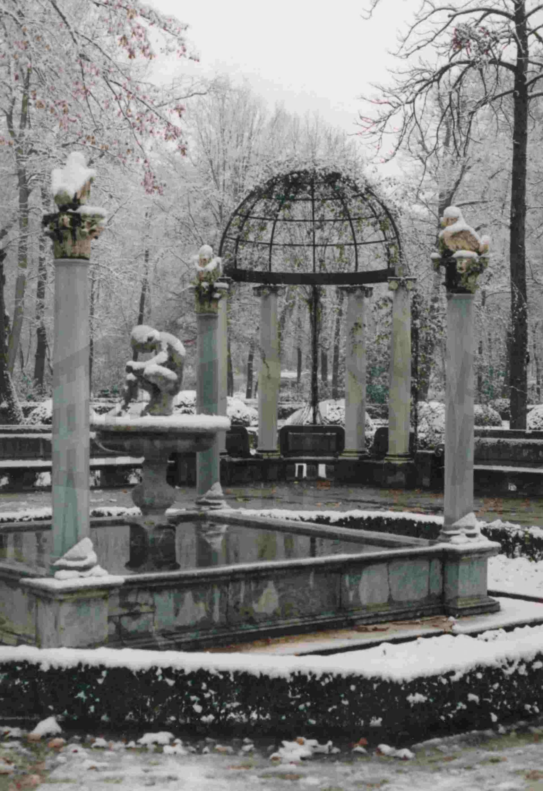 Fuente de Venus y alrededores en el Jardín de la Isla de Aranjuez tras una nevada