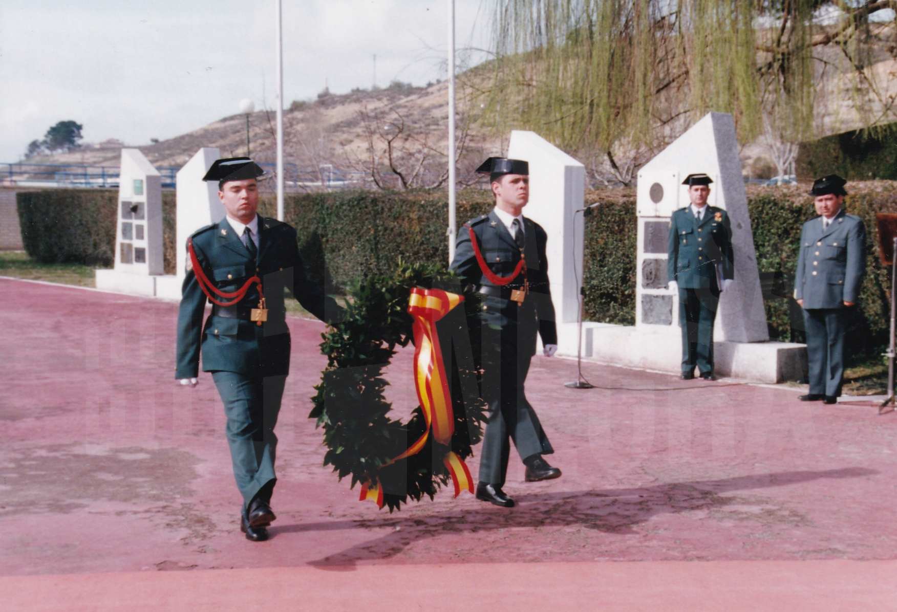 Guardias civiles portando la corona de laurel durante el acto de rejura de bandera de la 2ª promoción de la Academia de Aranjuez