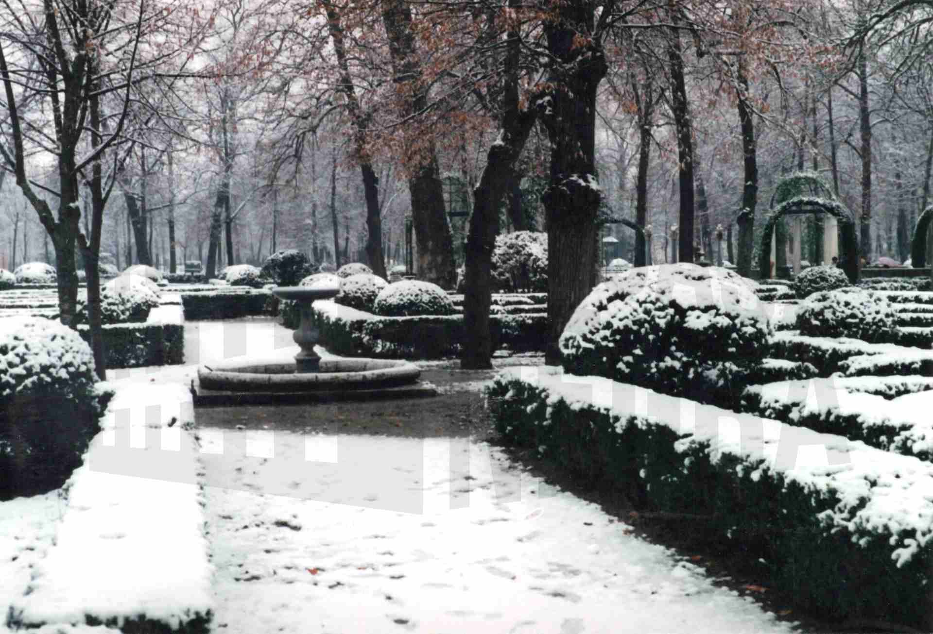 Jardín de la Reina y el Palacio Real en Aranjuez tras una nevada