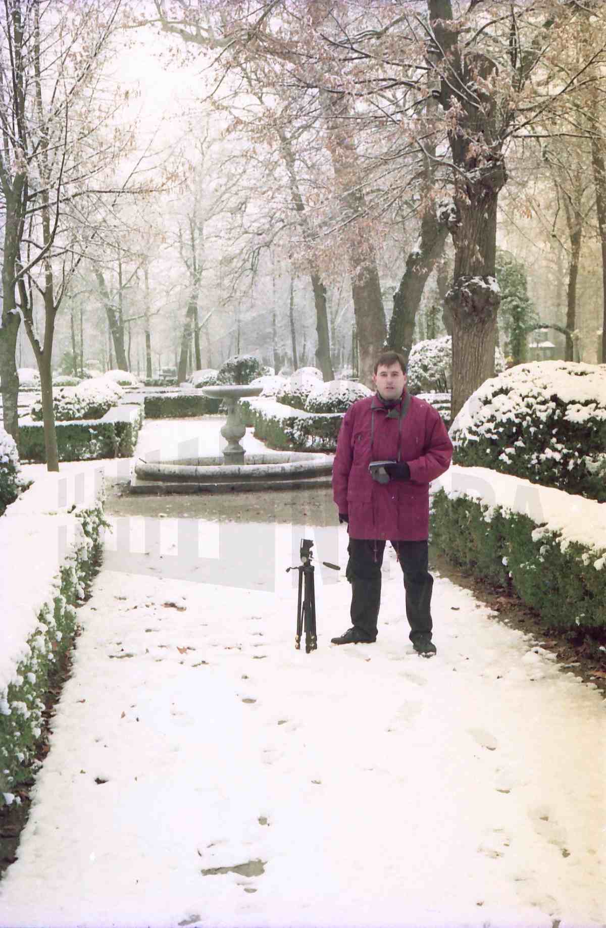 José Luis Talavera junto a la ría del Jardín de la Isla de Aranjuez nevado