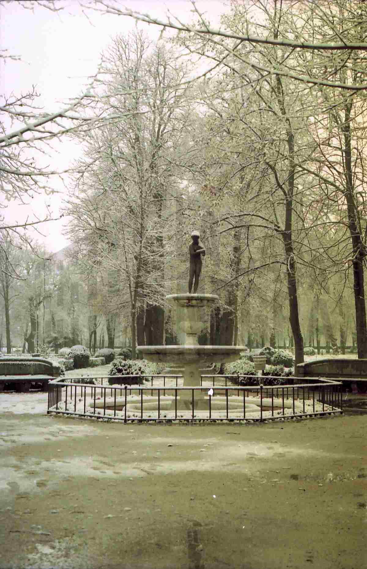 La Fuente del Niño de la Espina (o de las Arpías) del Jardín de la Isla de Aranjuez y sus alrededores nevados