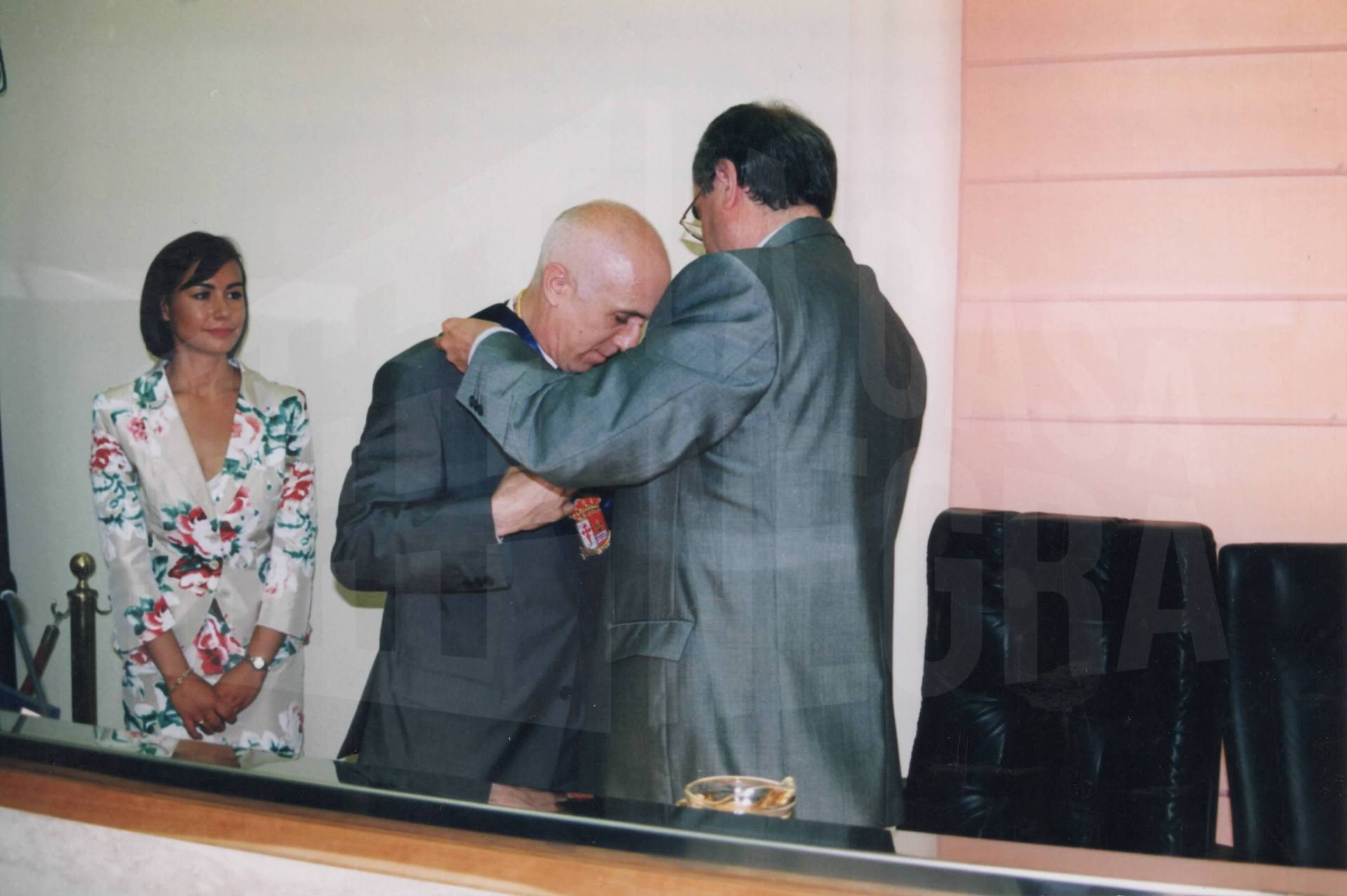 Reverso: " 14 JUN 2003 NUEVA CORPORACION SOCIALISTA ALCALDE JESUS DIONISIO BALLESTEROS LE ENTREGA EL BASTON DE MANDO EL Ex ACALDE EDUARDO GARCIA POR SER EL DE MAS EDAD DE LA MESA"