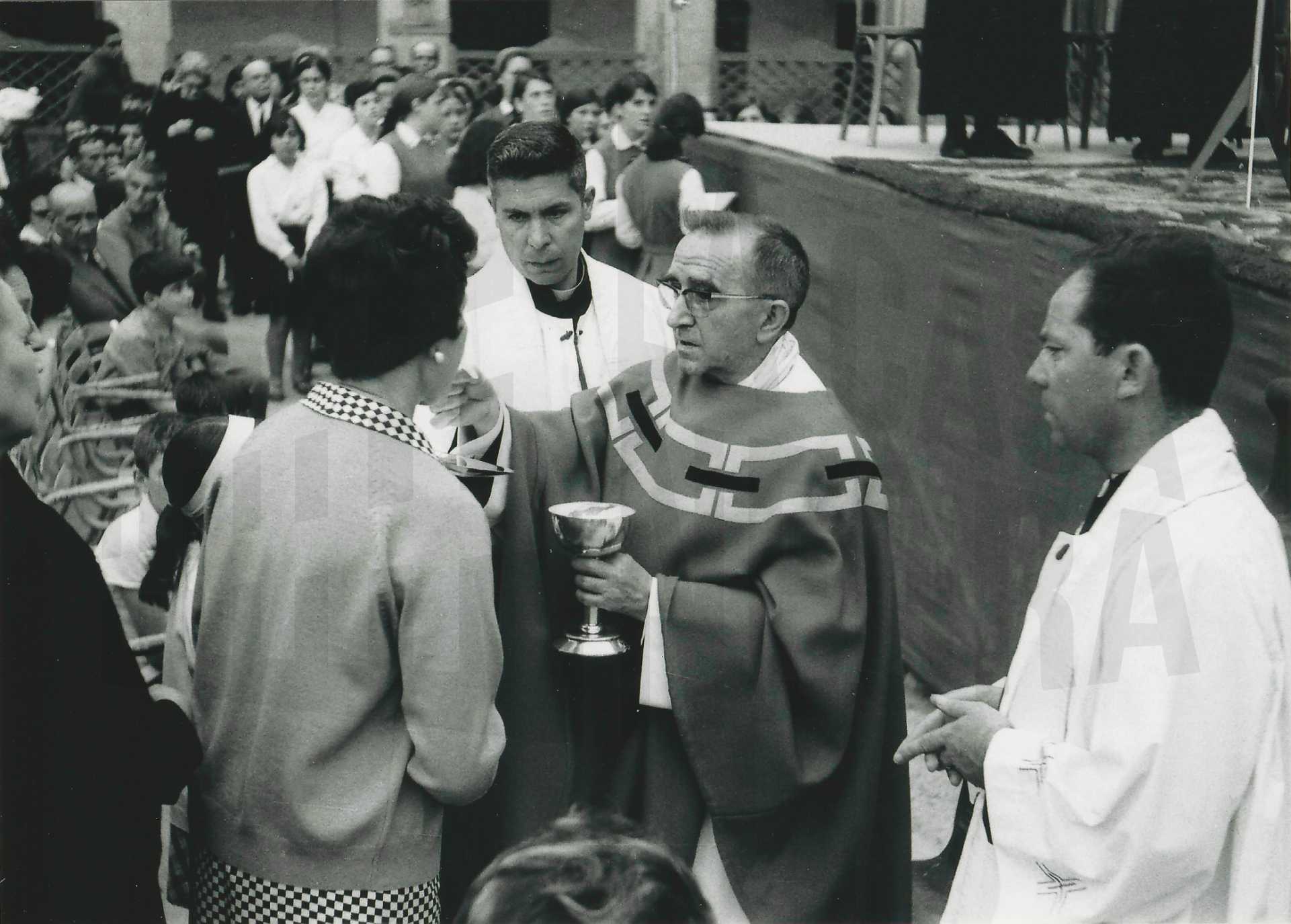 Reverso: "EL ARZOBISPO DE MADRID CASIMIRO MORCILLO VISITA ARANJUEZ OFIANDO UNA MISA EN LA CASA DE ATARFE AYUDADO POR VICTOR CARRETERO Y EL PARROCO JESUS HARO"