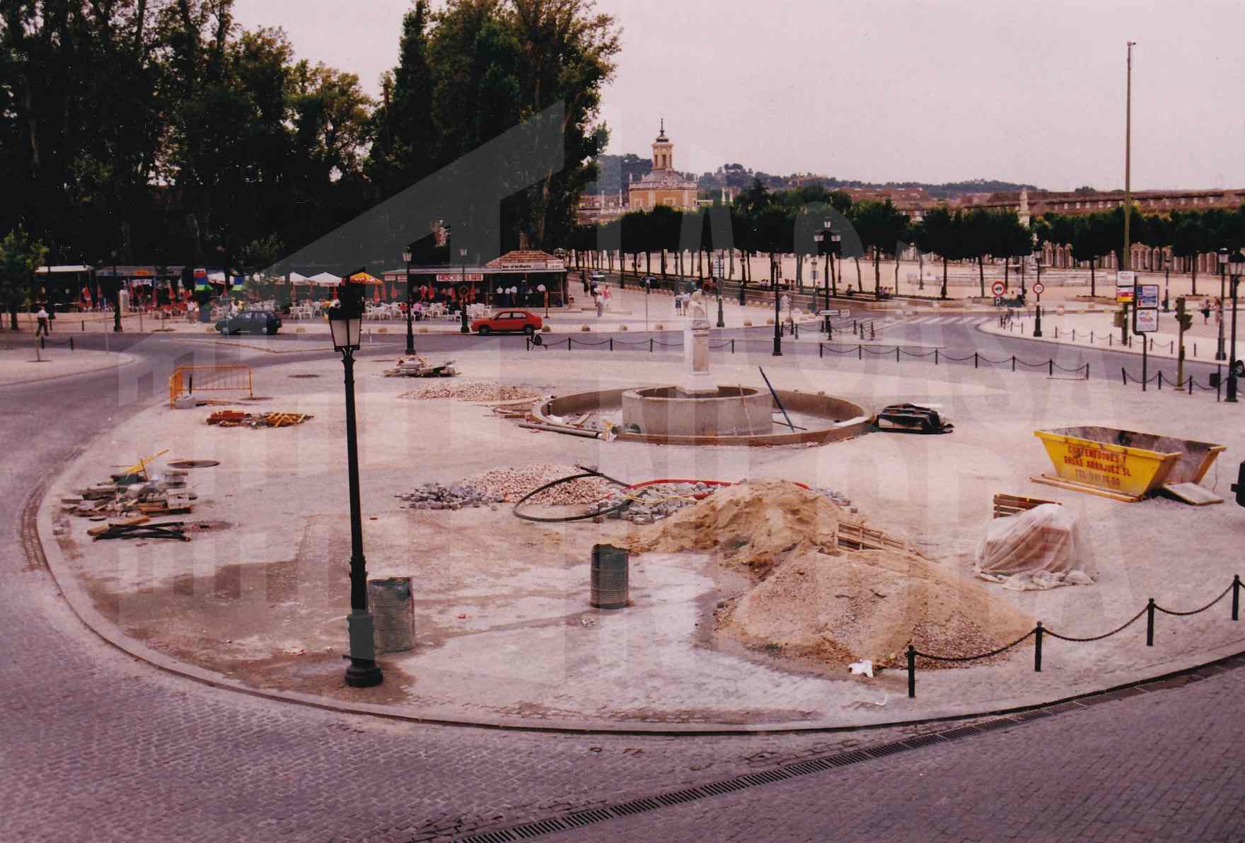 Obras de construcción de la fuente en la Plaza de Santiago Rusiñol en Aranjuez con las Casas de Oficios y Caballeros y la Plaza de San Antonio al fondo