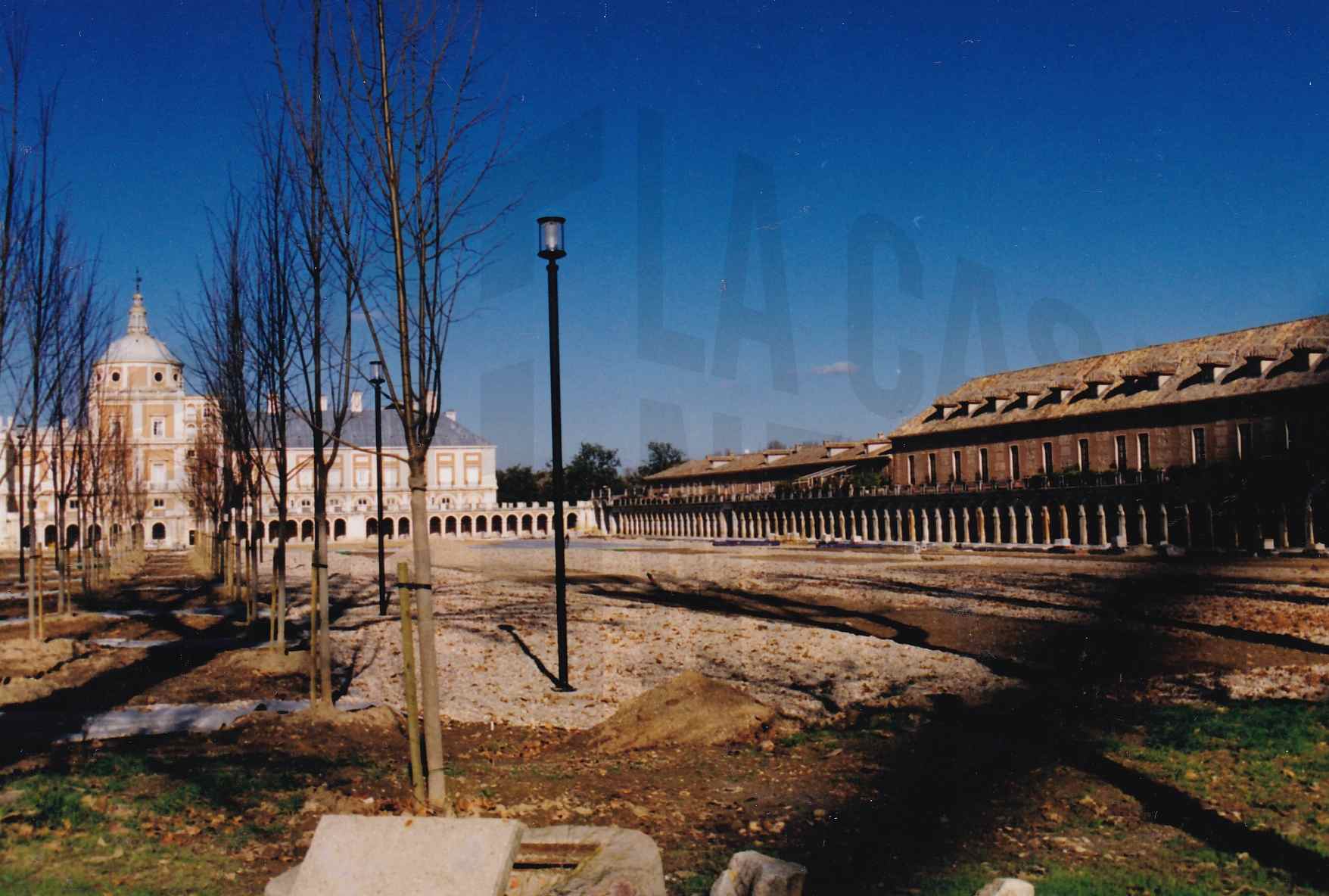Obras en la Avenida de Palacio y la Plaza de Parejas en Aranjuez con el Palacio Real y las Casas de Oficios y Caballeros