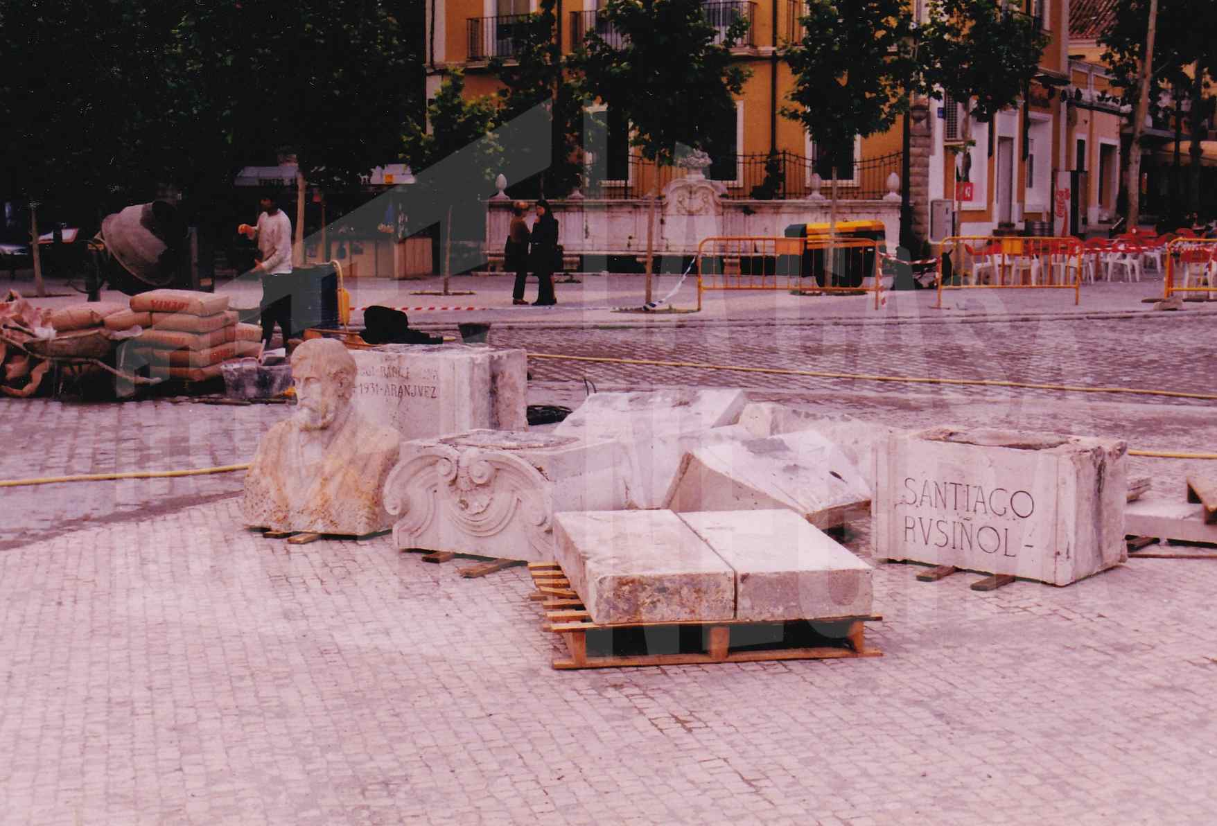 Obras en la Plaza de Rusiñol de Aranjuez con las piezas del monumento a Santiago Rusiñol en el suelo