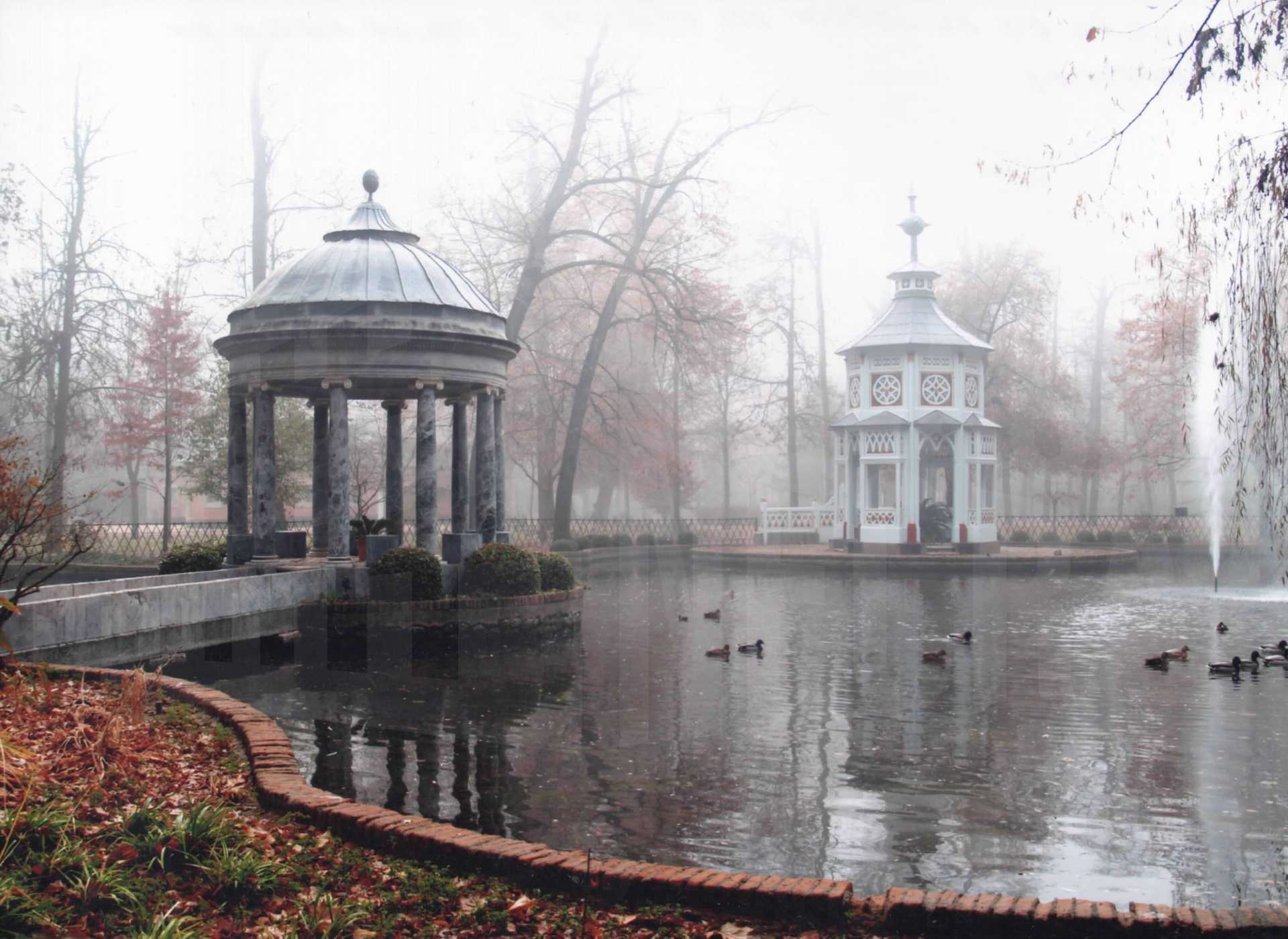 Pabellones en el Estanque de los Chinescos del Jardín del Príncipe de Aranjuez bajo la niebla