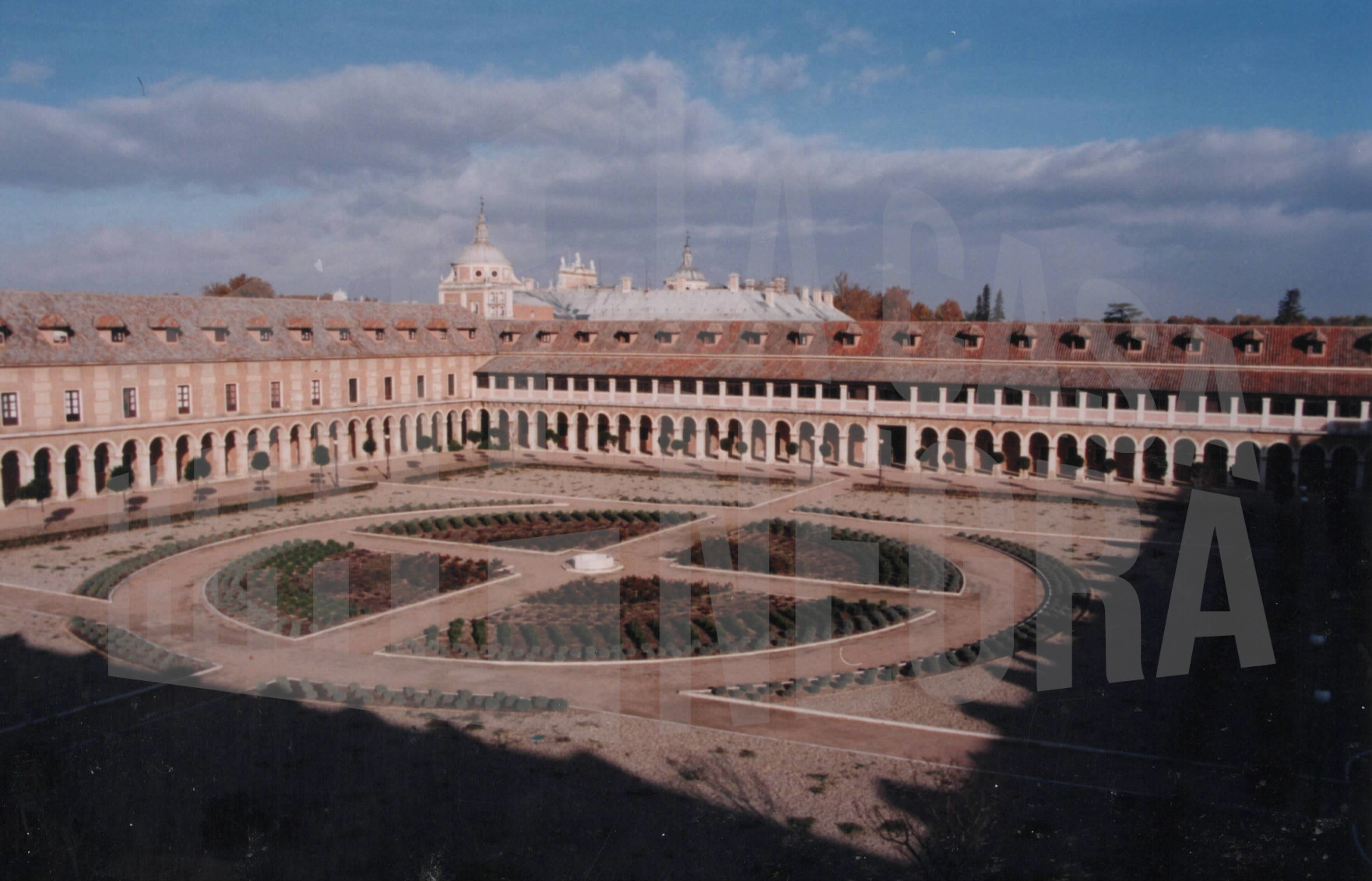 Patio interior de la Casa de Caballeros con las torres del Palacio Real de Aranjuez al fondo