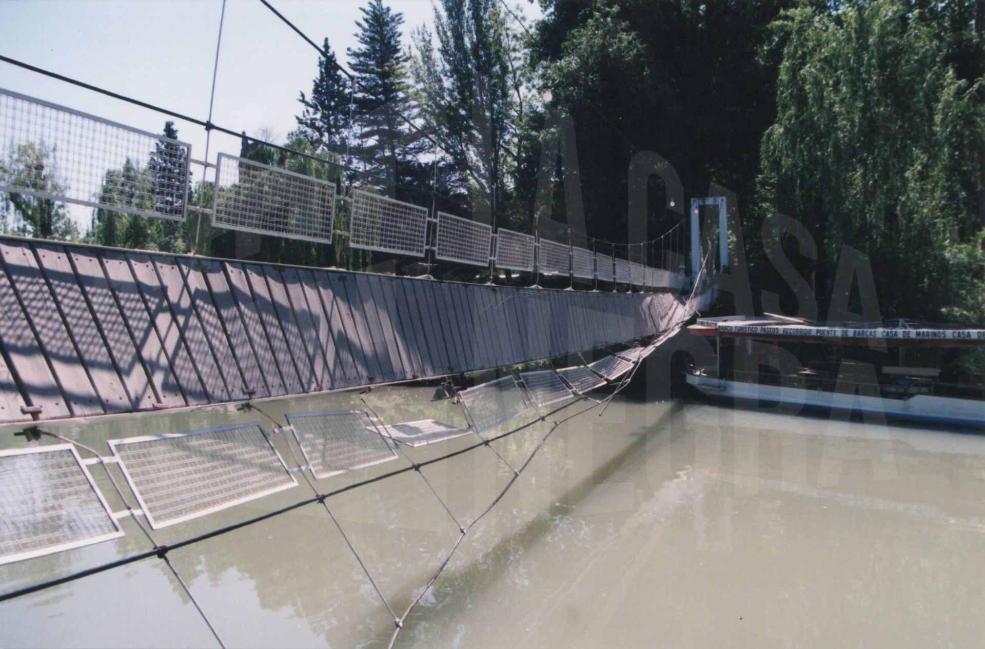 Puente colgante de El Castillo sobre el río Tajo tras su desplome, en Aranjuez