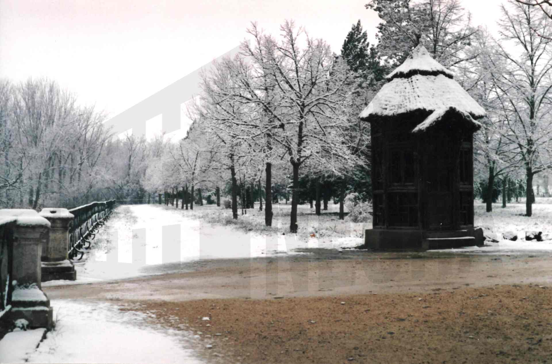 Puerta y el Puente de la Ría o de la Isleta en el Jardín de la Isla en Aranjuez tras una nevada