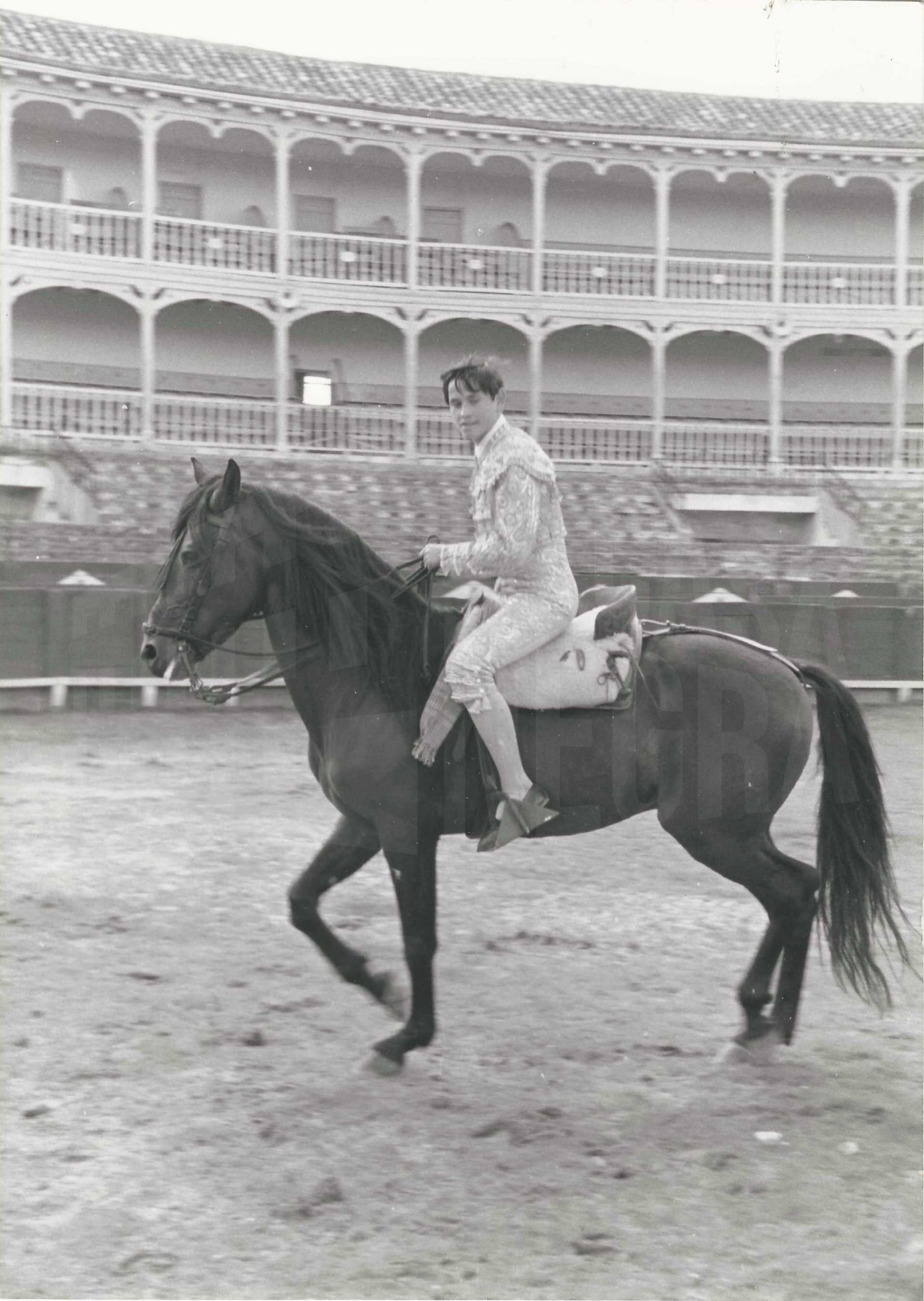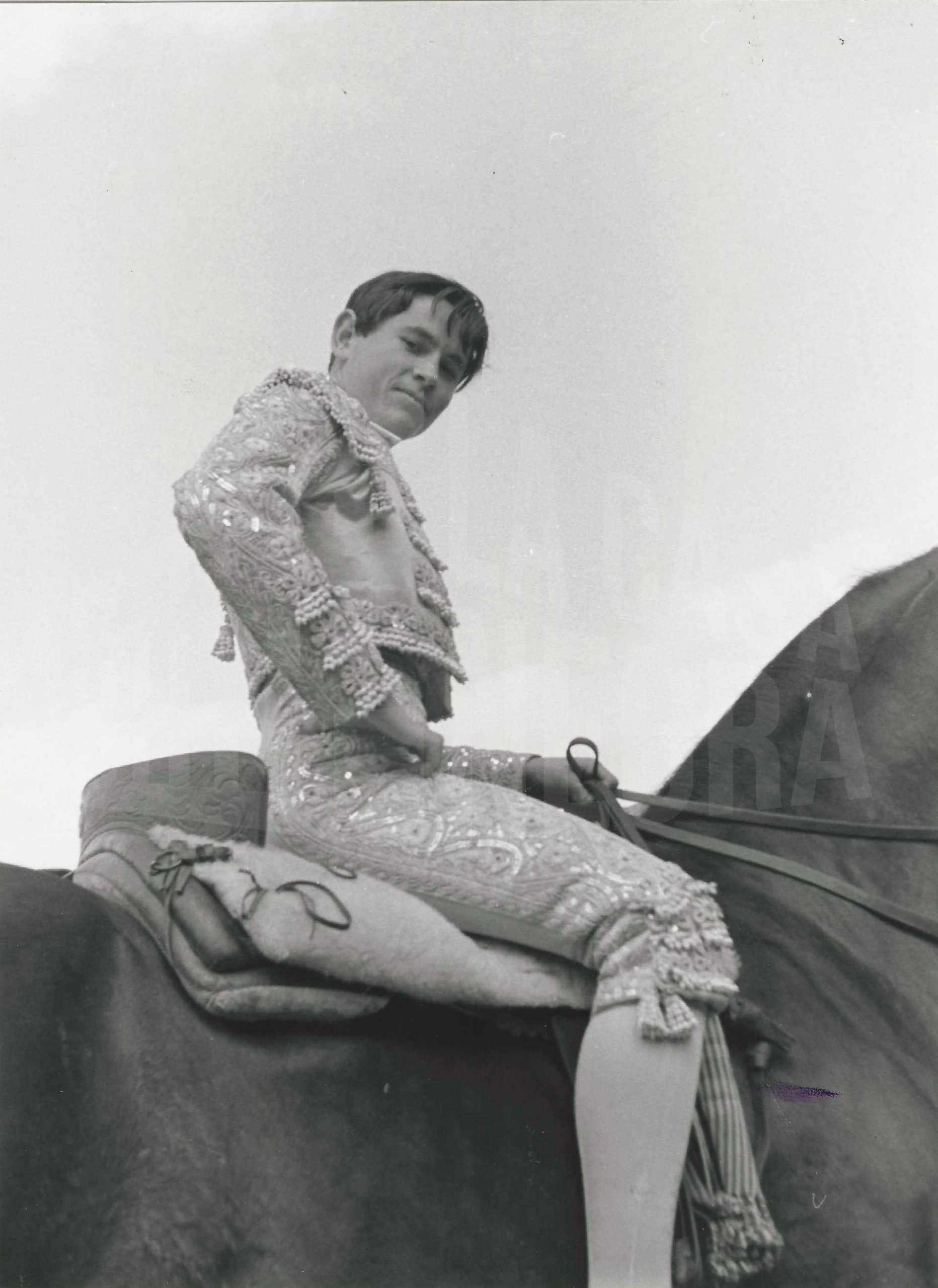 Retrato del torero Sebastián Palomo Linares a caballo en la Plaza de Toros de Aranjuez