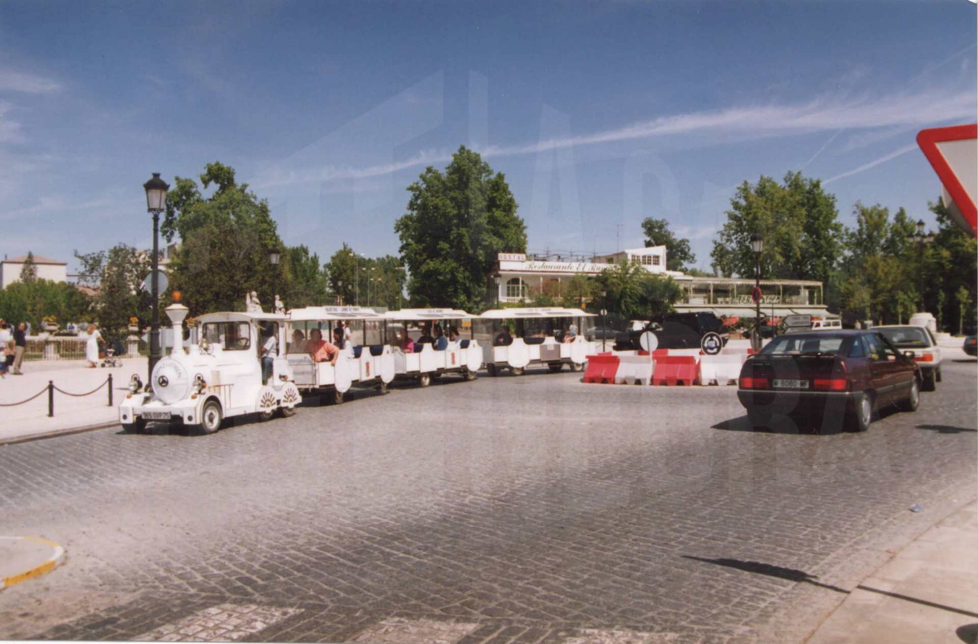 Tren turístico (Chiquitrén) circulando por la Plaza de Rusiñol tras su remodelación, en Aranjuez