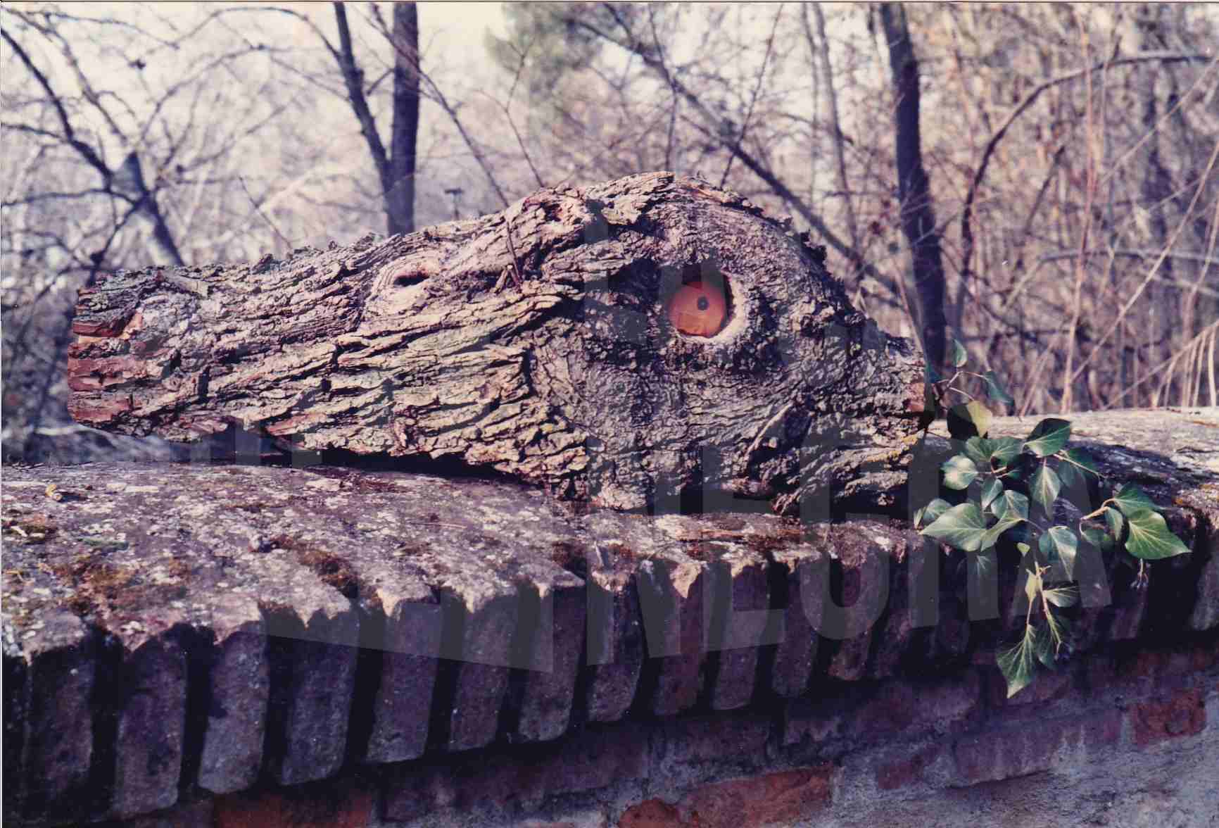 Trozo de un tronco que semeja la cabeza de un animal sobre un muro de ladrillo en el Jardín del Príncipe de Aranjuez