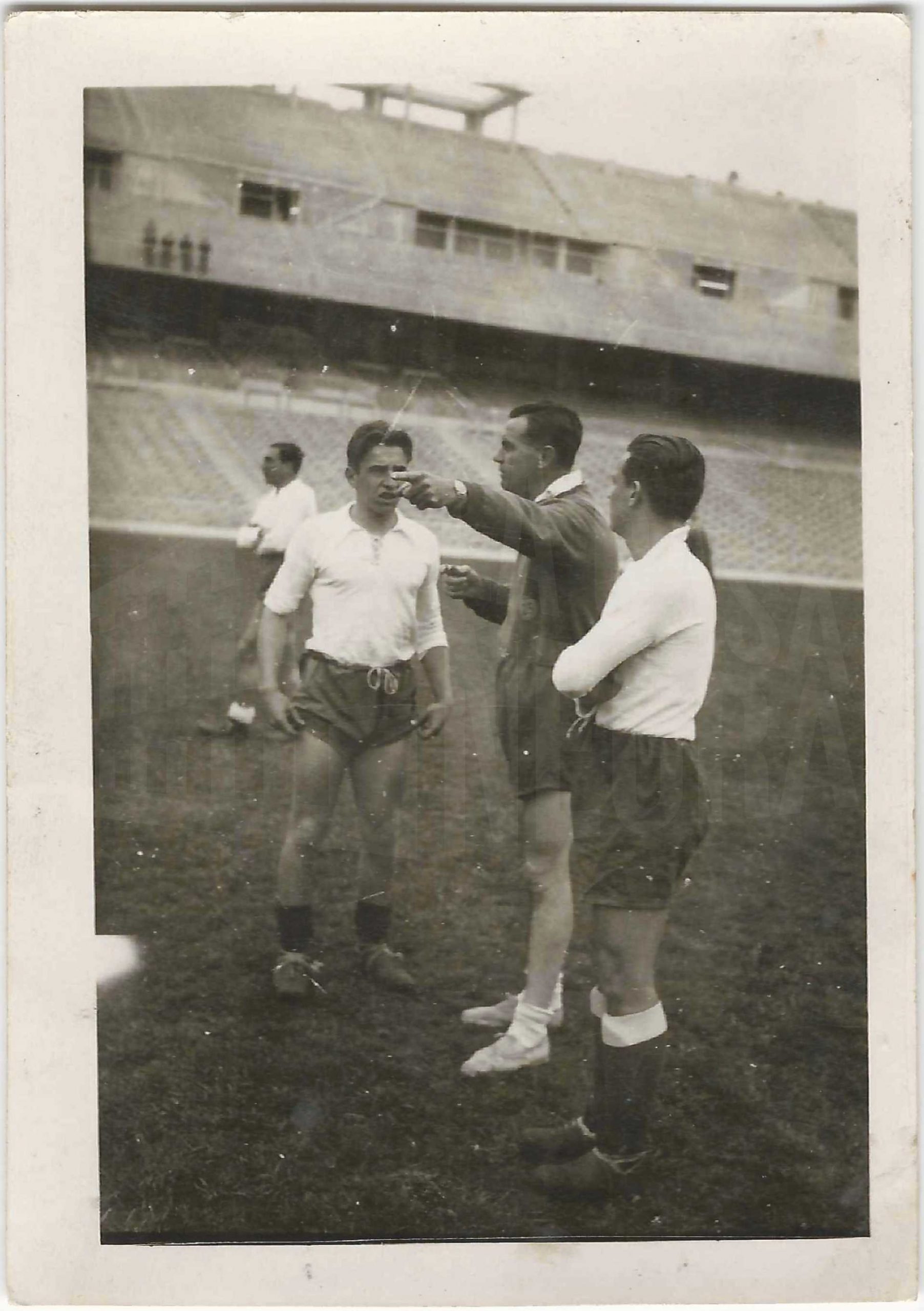 Un entrenador da indicaciones a los jugadores en un entrenamiento de fútbol en un estadio sin público
