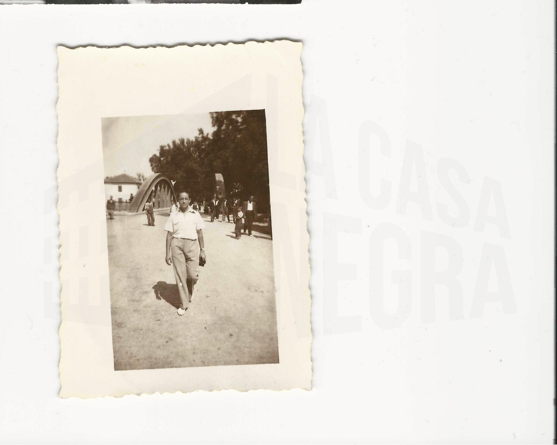 Un hombre caminando con el antiguo Puente de Barcas detrás, en Aranjuez