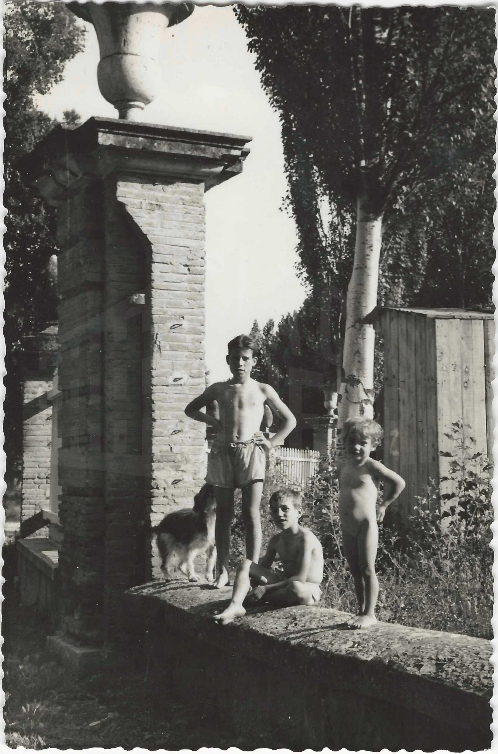 Reverso: "Foto de los años primeros de los 60. Esta escena era habitual en cualquier sitio de baños en Aranjuez. El lugar era el caz de las Aves que pasa por las medianerías de MAFE cerca de la carretera de la Pavera."