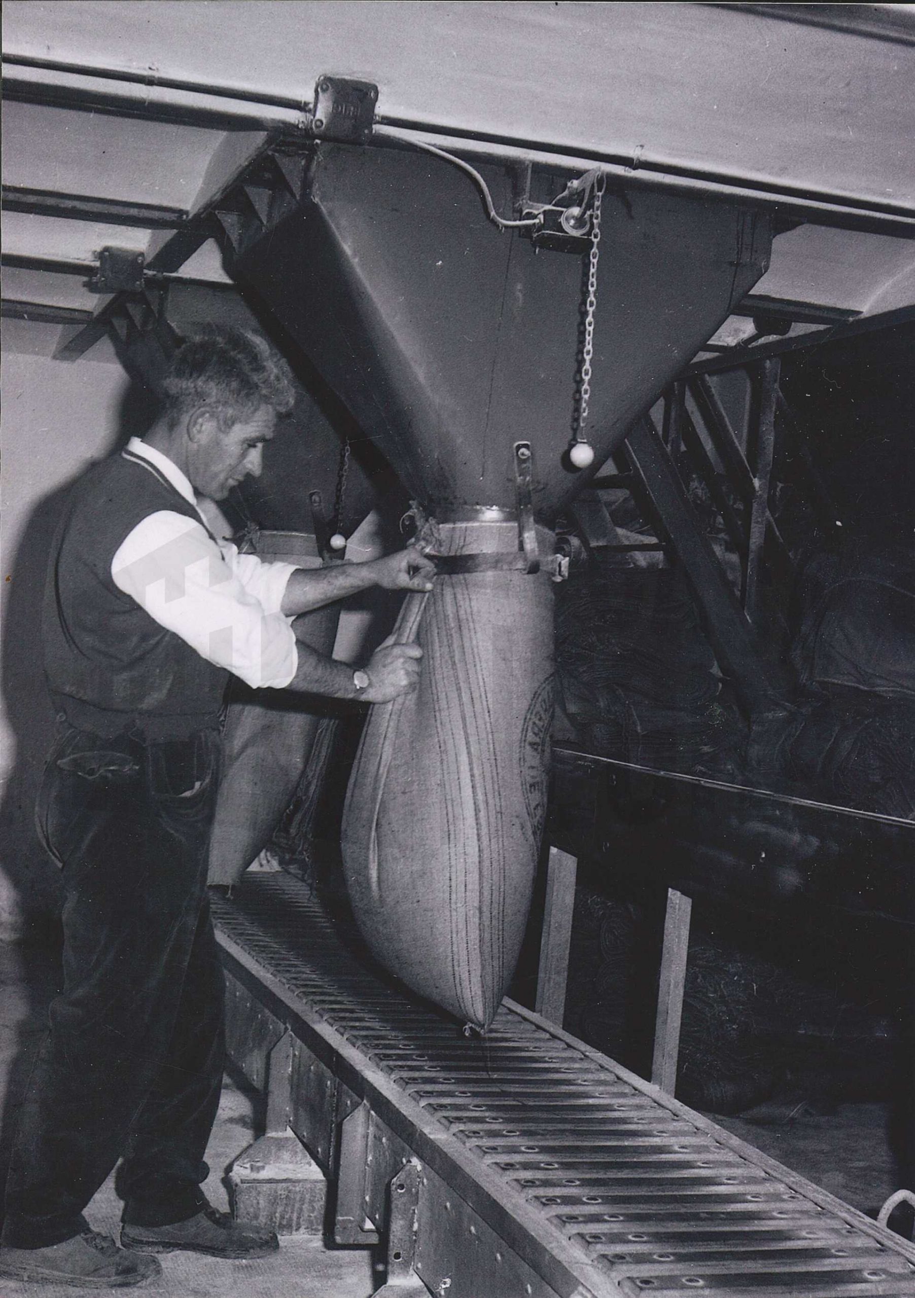 Un trabajador llenando un saco en la Azucarera de Aranjuez