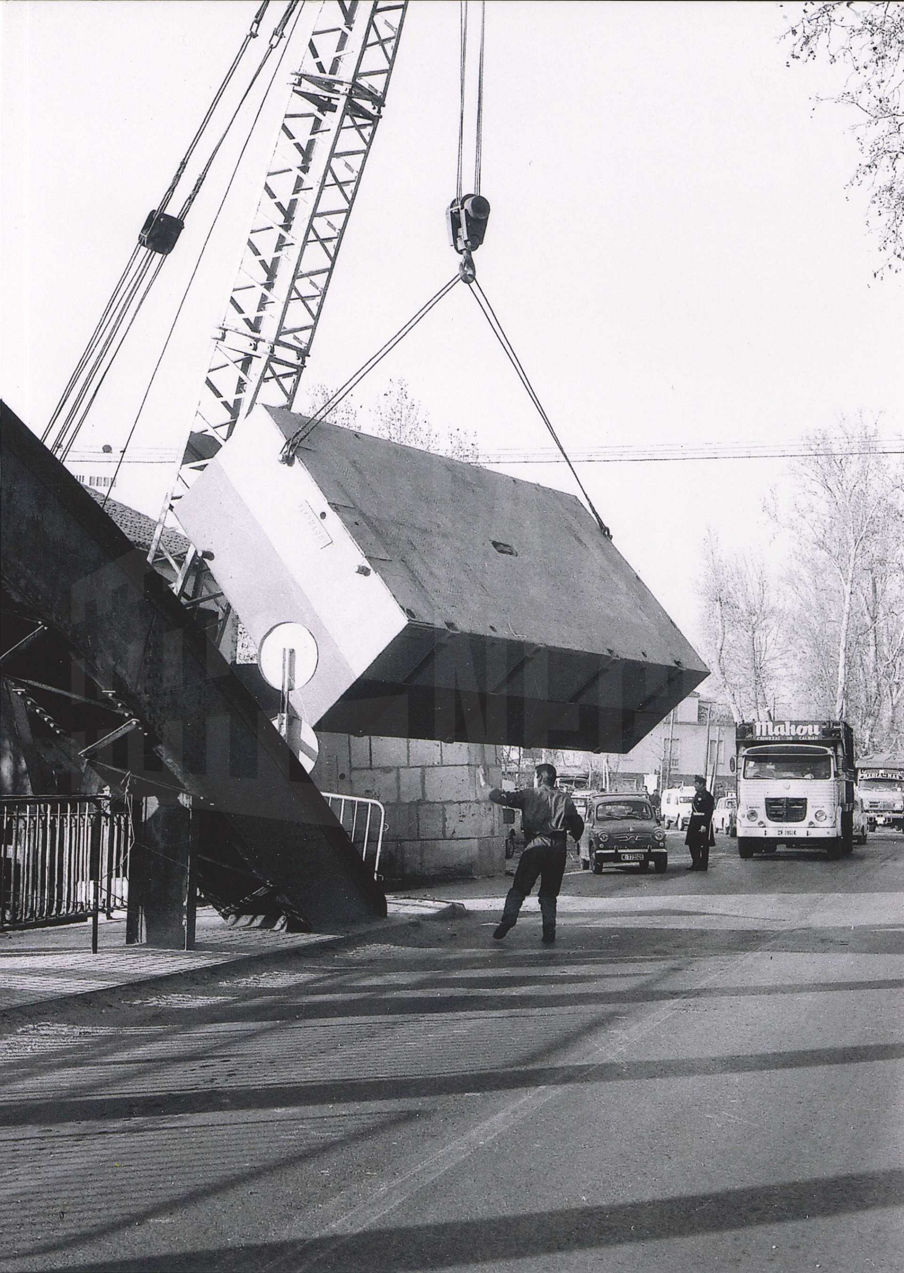 Una grúa sostiene un bloque de cemento