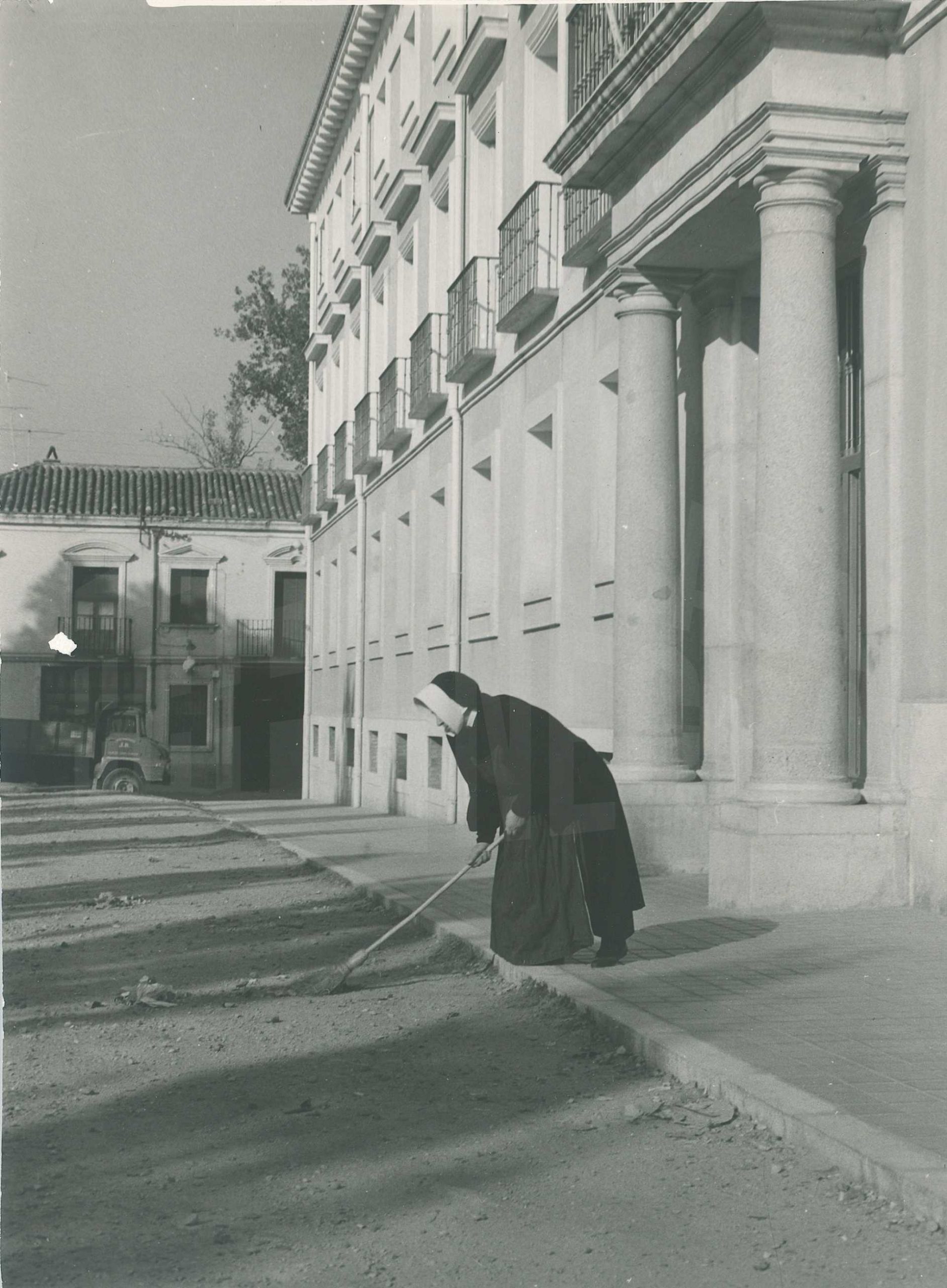 Una monja barriendo la calle del Príncipe frente a la puerta del colegio Sagrada Familia de Aranjuez
