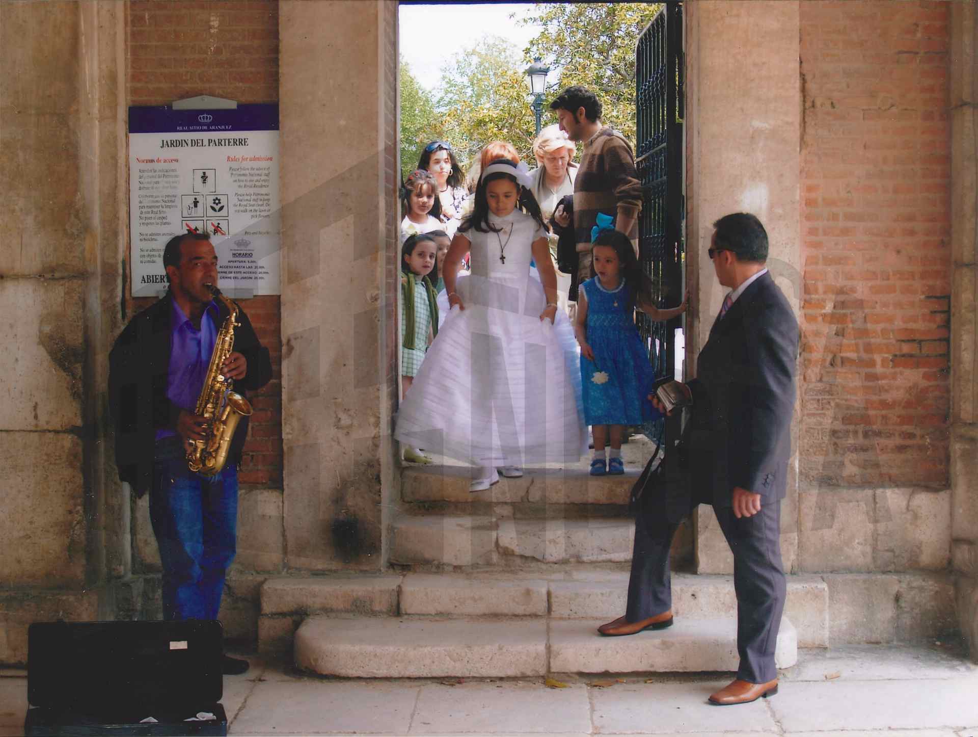 Sé el primero en valorar “Una niña vestida de comunión junto a otras personas sale del Jardín del Parterre en Aranjuez”