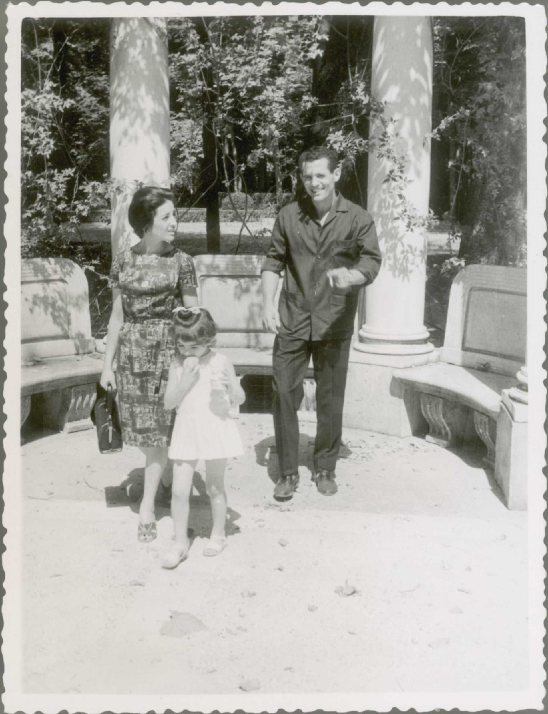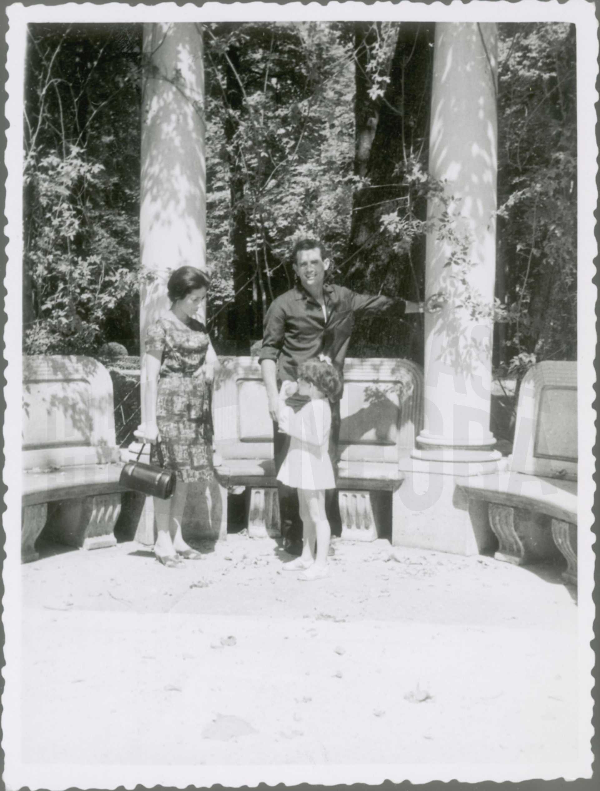 Una pareja con una niña en la Plaza de las Exedras del Jardín de la Isla en Aranjuez